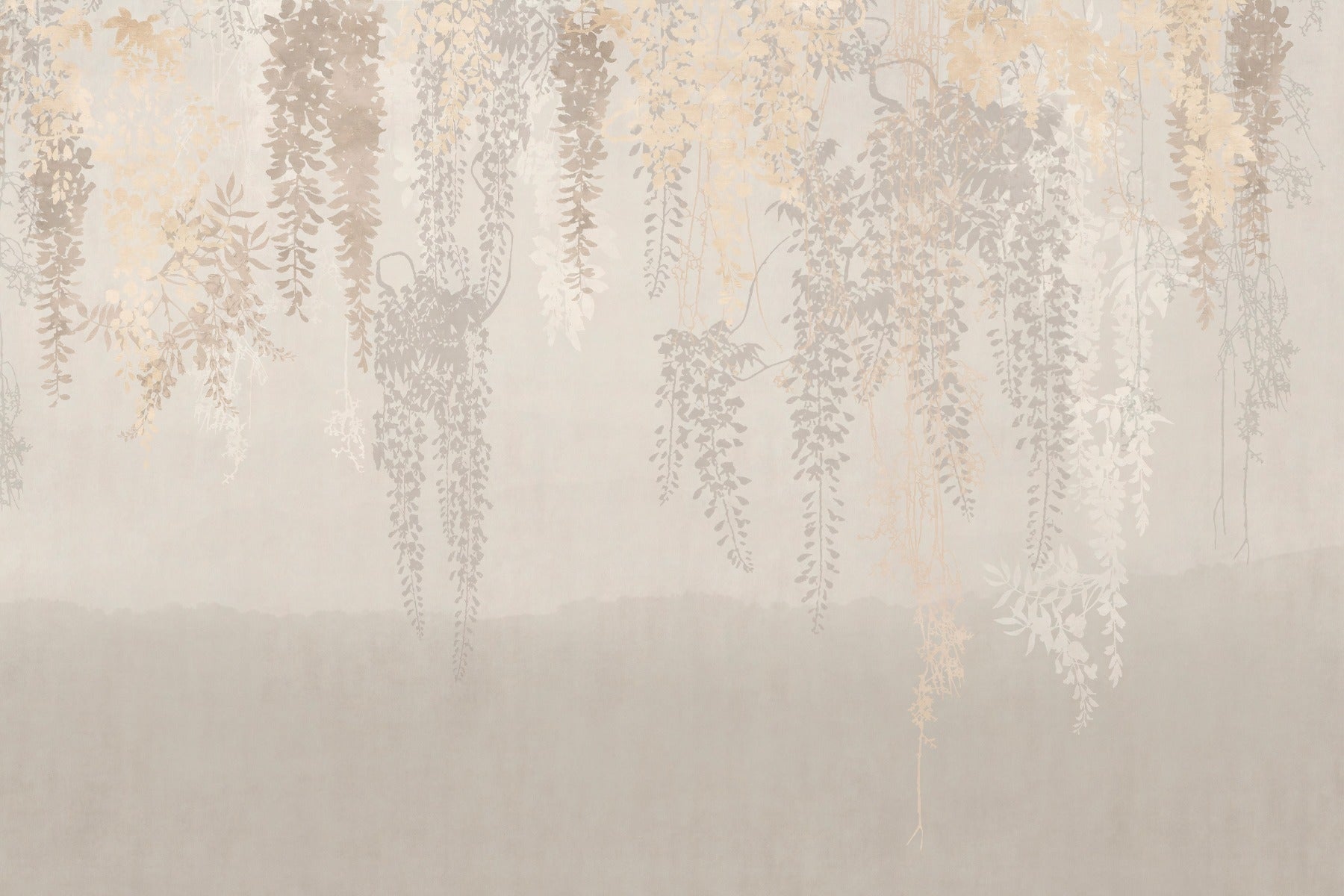 Elegant Hanging Leaves Wallpaper in Golden Beige Tones