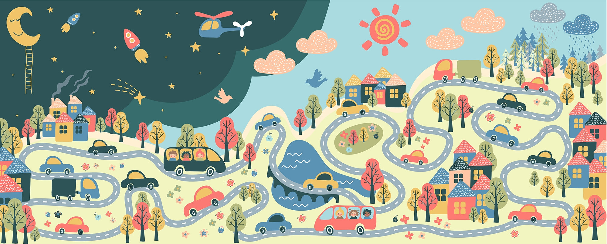 Imaginary Cartoon Cityscape Wall Murals is playful, where the colorful houses, twisty roads, and cheery trees, along with friendly cars, create an imaginative aura. The day-and-night theme split also adds in some fun dynamics, the sunlit scenes on one side and the dreamy night starry sky on another side. Perfect for nursery rooms, kids' bedrooms, and play areas, this cartoon wallpaper brings an adventurous, imaginative atmosphere to the premises. In color cartoon-like details that capture the imagination and spark creativity, a peel-and-stick version makes installation effortless and changeable; it is playful and functional enough to deck out kids' spaces with loads of charm and personality.