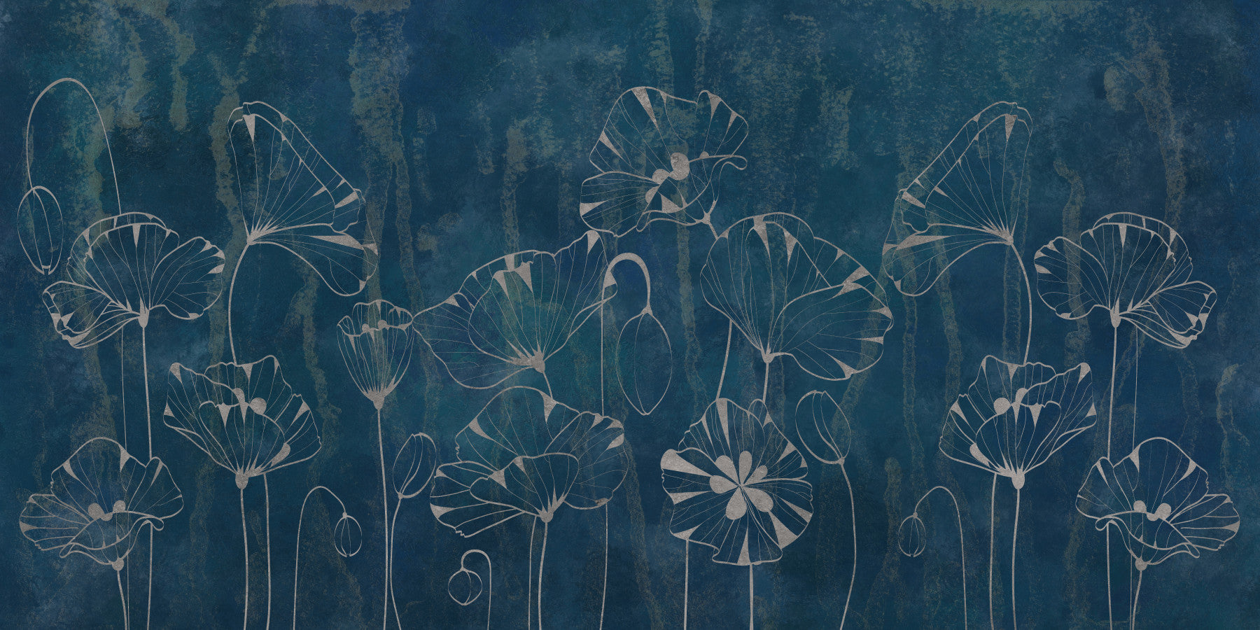 Dive into the depths of Indigo Poppy Dream wallpaper for walls, where delicate floral outlines meet a moody, textured backdrop. The design features simple, elegant poppy illustrations in a soft silver hue against shades of deep indigo and teal. It crafts a sophisticated yet comforting atmosphere, ideal for bedrooms, living rooms, or hallways. Let this dreamy wall covering bring a touch of nature-inspired serenity and classic style to interiors.
