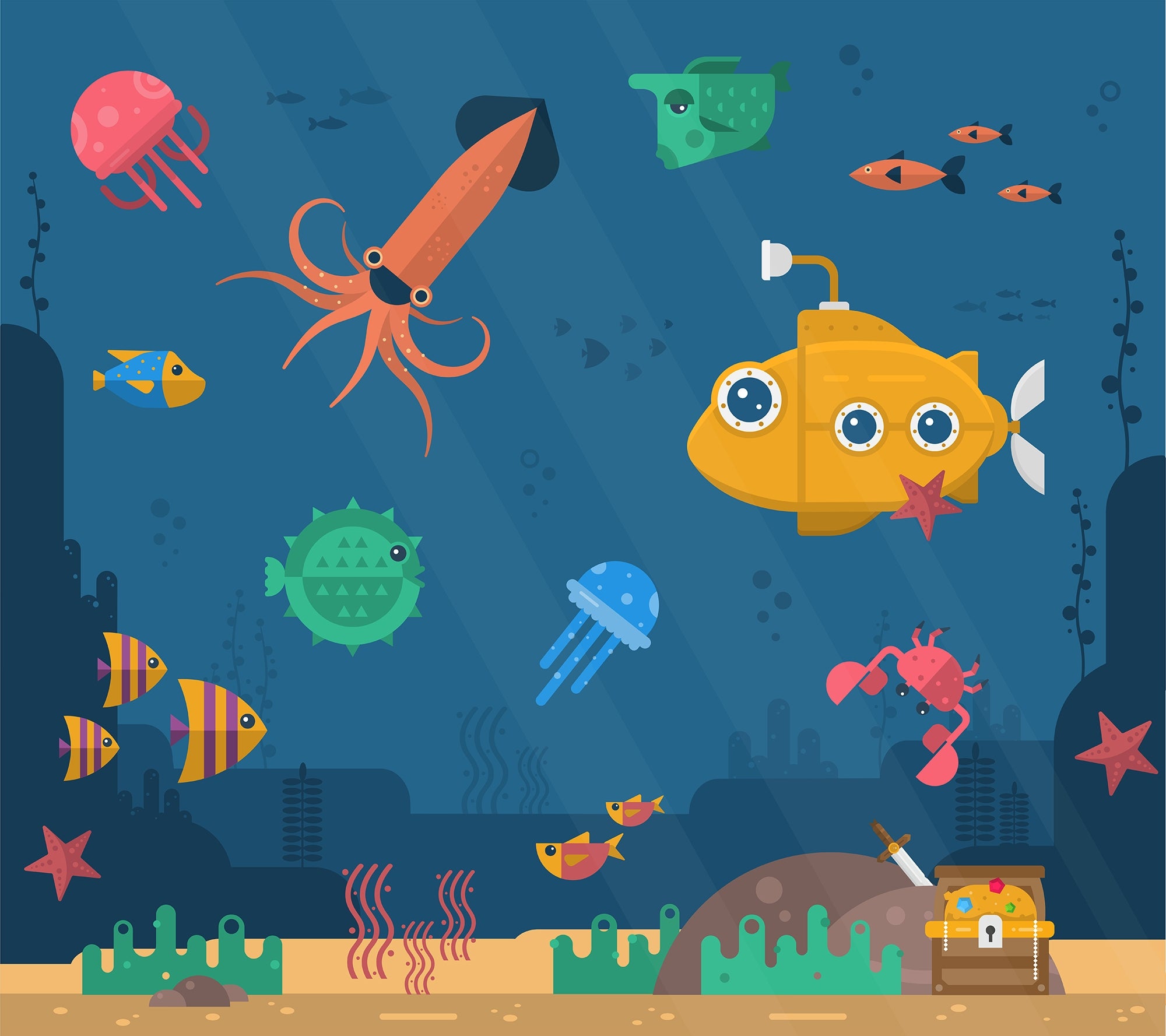 The Inside the Ocean View Wallpaper Murals brings the colorful world underwater to life. Featured with colorful marine animals, a cheerful submarine, and playful underwater scenery, this design is perfect for kids' rooms, play areas, or educational spaces. Vivid hues, delightful details, and other visual factors make it engaging and entertaining enough to stimulate imagination and interest in ocean life. Durable and easy to install, this ocean mural transforms an ordinary wall into a perfect underwater adventure. A super addition to your space that captures the energy and creativity there while celebrating the beauty of the ocean.