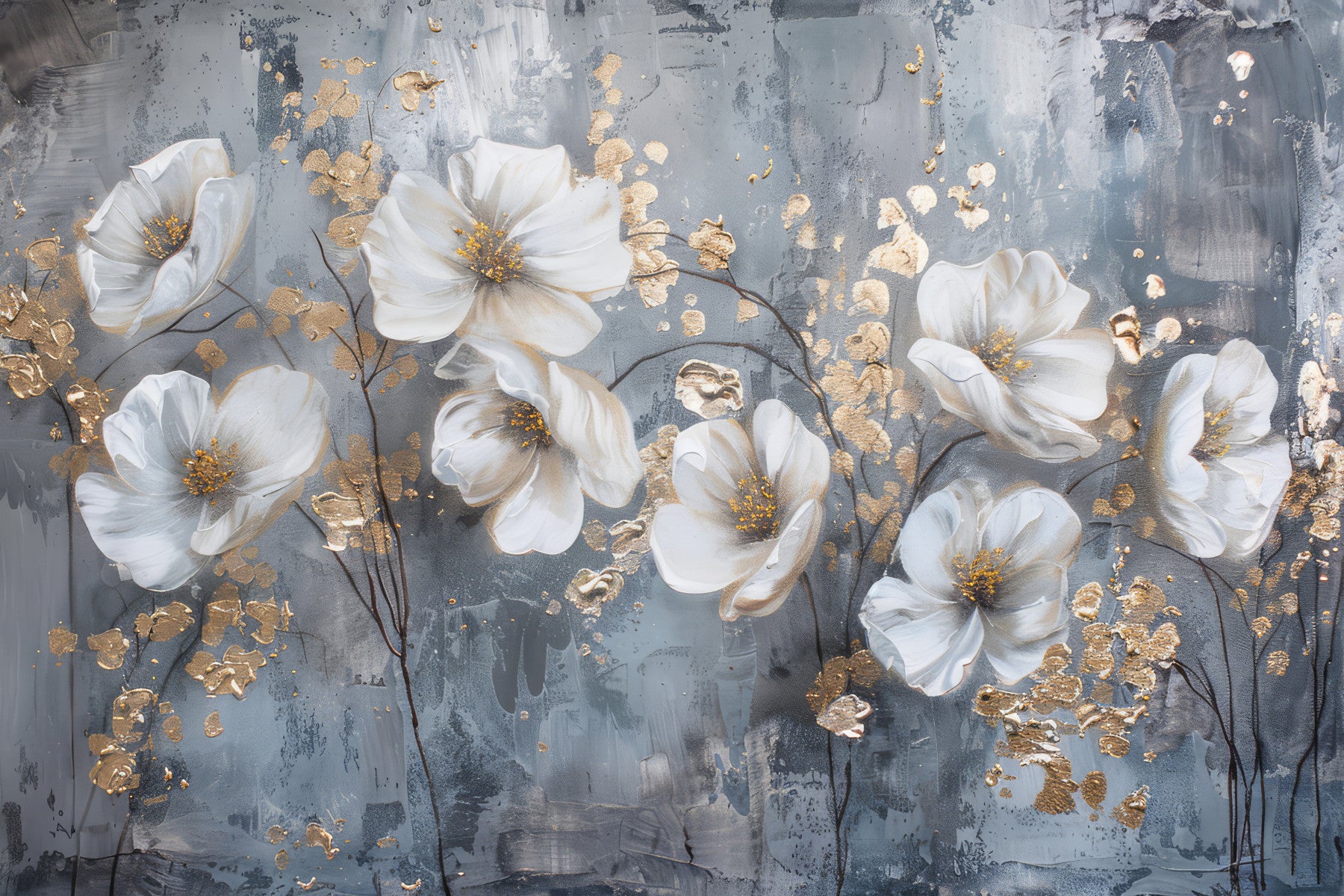 Let this delicate floral pattern transform your space. Ivory petals open up against a textured gray background, highlighted by gold accents. The painterly effect adds depth and a sense of luxury. Consider this wallpaper for walls in a dining room, where it will create an inviting atmosphere. It also makes a charming backdrop for a hallway or bedroom, creating a space that feels both calming and elegant. The subtle color palette ensures it complements various interior styles.