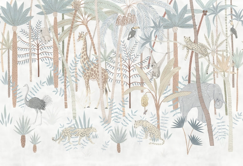 Bring your child's imagination to life with this jungle animals wallpaper mural. It would be perfect for a children's room as it creates a whimsical scene where giraffes, elephants, leopards, and more are set amidst luscious trees and plants. Every detail encourages curiosities and adventures, making it such a great backdrop for play and creativity. Soft pastel colors will add a soothing ambiance, thus ideal for nurseries and playrooms. This kids room mural wallpaper effortlessly adds a touch of fun and wonder that will transform any room into an enchanting jungle safari that children will love, all while being easy to apply and durable, making this a fantastic choice for lively spaces.
