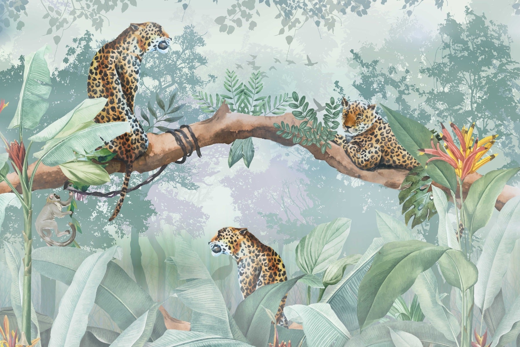 The leopard wallpaper mural meanwhile, describes a calm forest scene where leopards rest on tree branches surrounded by lush green vegetation and tropical leaves. This wildlife wall design creates a serene jungle vibe for your space. The wall mural colors are soft and hand-painted-looking; thus, they fit beautifully with spaces such as nurseries, kids' rooms, or quiet corners. Every detail, right down to the leopard's spots and leaf texture, is such that it takes the edge off too much. This mural is just that simple: A natural feel with the charm of wildlife, which is soothing as an everyday wallpaper for the common room.