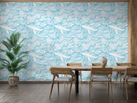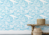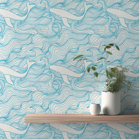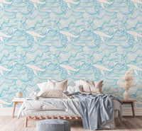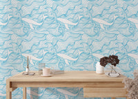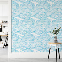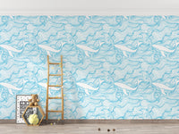 Light Blue Pattern Stormy Waves and Whales Wallpaper