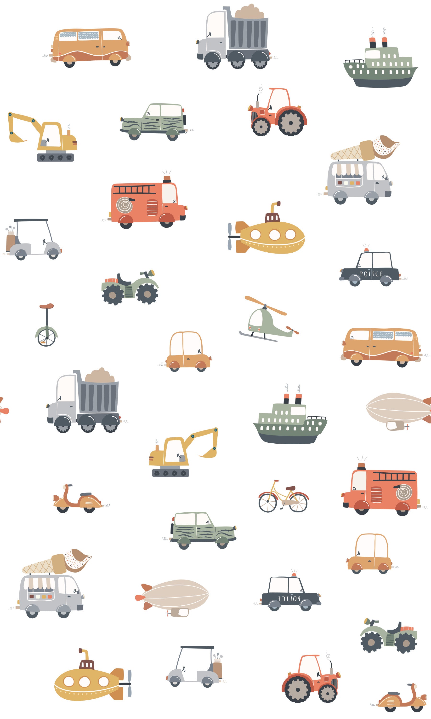 Fuel your child's imagination with our Little Wheels Adventures Wallpaper. This delightful pattern features a hand-drawn collection of cars, trucks, and ships in soft, earthy tones. Designed for nurseries and playrooms, the vintage-inspired illustrations include fire engines, tractors, and ice cream vans that spark curiosity. Our high-quality material is easy to apply and durable enough for busy play spaces. Create a cozy and inviting atmosphere that celebrates movement and discovery. This timeless transport theme complements modern decor while providing a fun backdrop for daily play. Give your walls a playful update today.