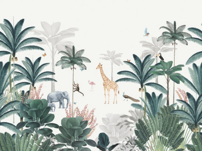 The Lush Forest Animals Wallpaper Mural is a bright and playful exhibit of happy animals in a dense green forest setting. It is perfect for a nature-feeling room, including everything from a child's bedroom to a nursery or playroom. Perky soft colors and friendly animal wallpaper designs add adventure and tranquility. Made of very durable material for simple application, it's meant to last and be easy to install. A great way to make any space fun and natural, it is perfect for animal lovers and nature enthusiasts.