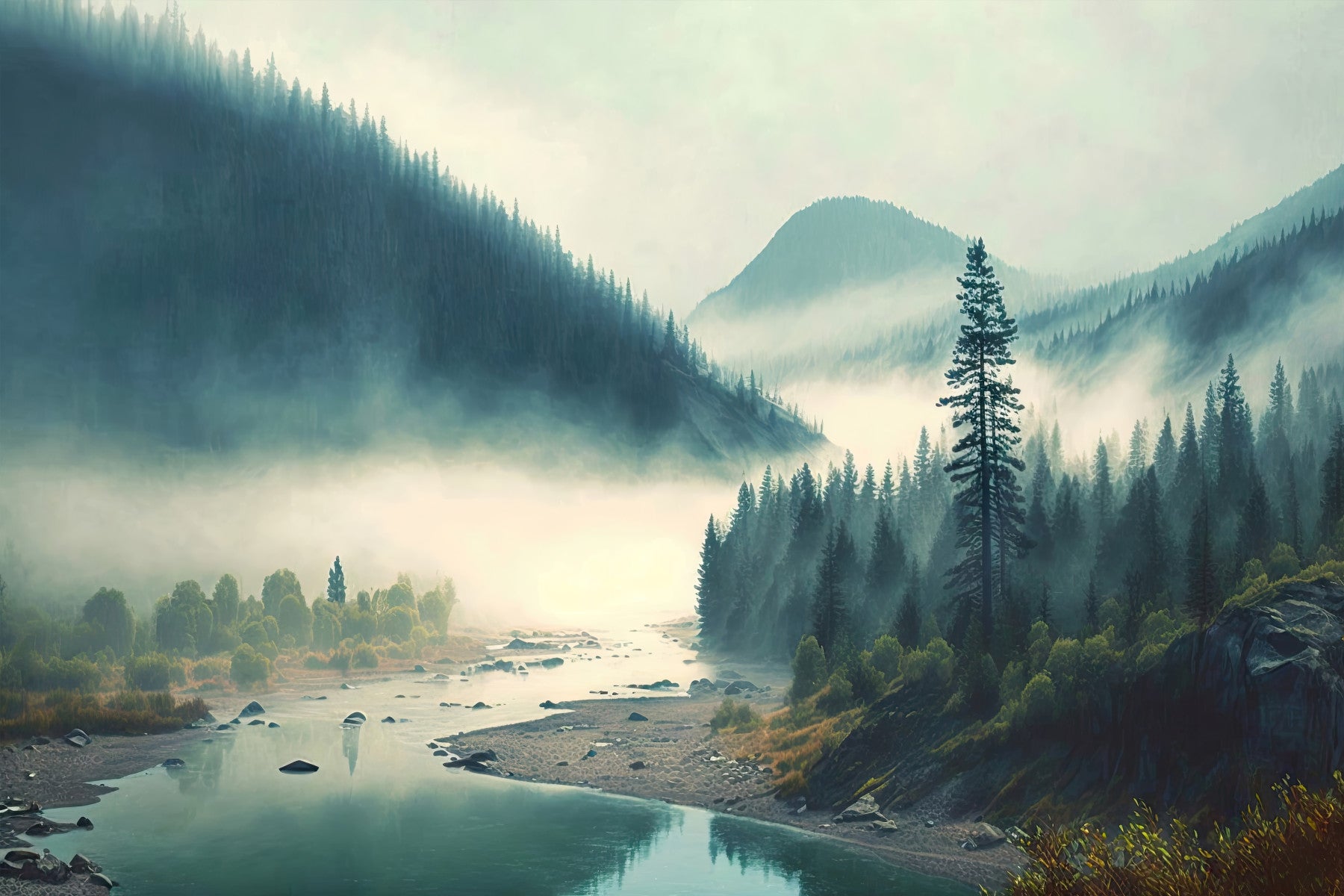 Escape into the serene embrace of 'Misty Mountain', a captivating wallpaper that evokes tranquility and awe. This stunning image portrays a secluded mountain valley shrouded in a delicate veil of mist, where towering, evergreen forests meet the gentle flow of a pristine river. Sunlight filters through the ethereal haze, casting a soft, golden glow upon the landscape, highlighting the textures of the rocks, trees, and the shimmering water. The cool blues and greens create a soothing ambiance, perfect for calming the mind and creating a peaceful atmosphere in any space. Immerse yourself in the quiet beauty of nature with this breathtaking wallpaper.