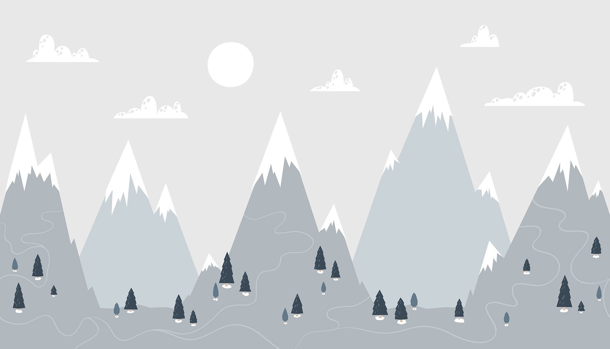 Capture serene beauty with snow-capped mountains, rolling hills, and scattered pine trees through minimalist design in the Modern Scandinavian Alpine Charm Wallpaper Mural. It evokes soft tones of gray, white, and muted blue in the background to create a perfect view in contemporary ways. Perfectly suited for nurseries, living rooms, or workspaces, it's simple yet striking to reflect Scandinavian style, with a touch of nature's tranquility in your space. The highly versatile color scheme makes for a harmonious fit in any decoration, thus beautifying and modernizing the look of the walls.