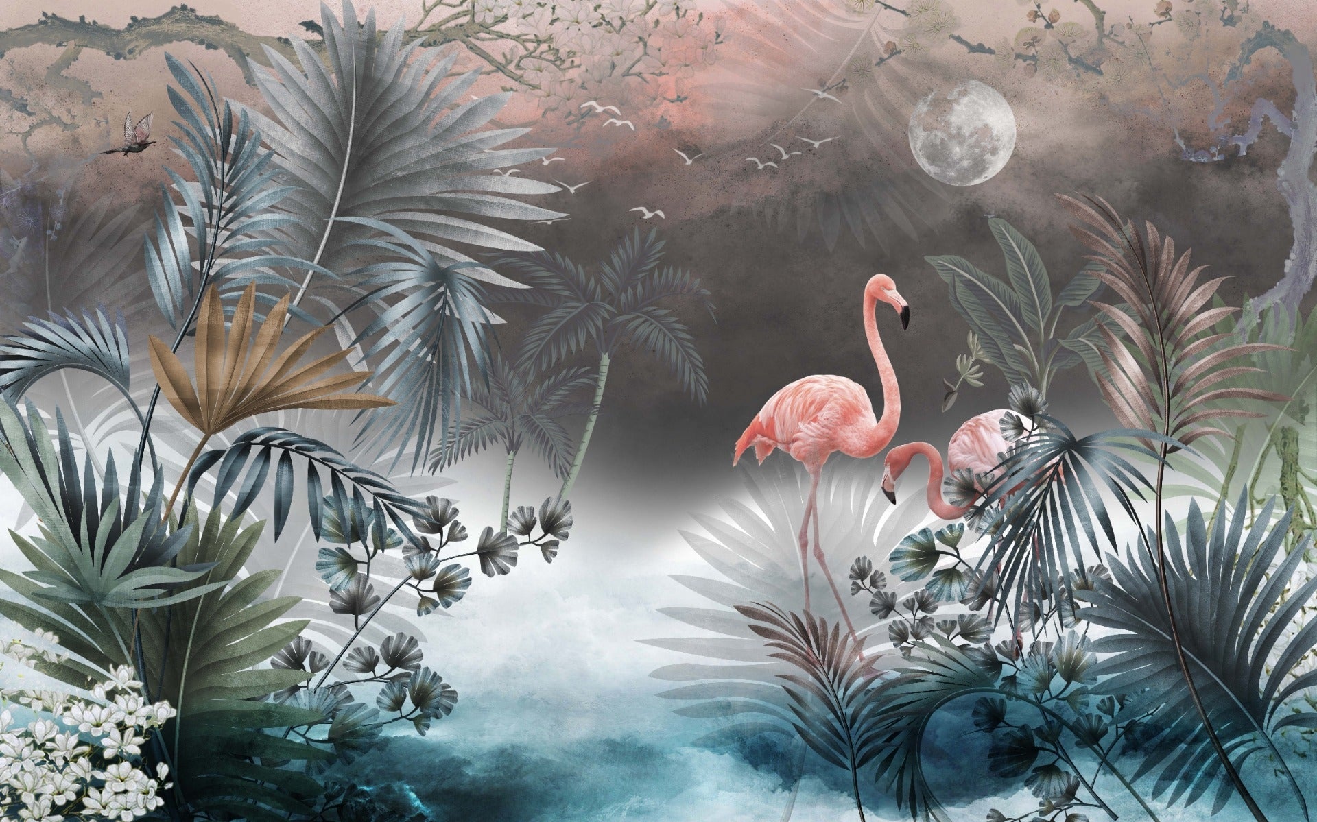 What better way to decorate your home than with the one-of-a-kind Monstera leaf pattern? This simple wallpaper mural features impressions of these lovely leaves and adorable flamingos, as well as dotted patterns, to effortlessly elevate your interiors and add a tropical touch. The colors are kept muted in greys and whites, with the flamingos adding a splash of color to the design. Choose this design if you want a quick refresh that is easy on the eyes and complements your minimalistic interiors. Combine it with clean-lined Nordic furniture. With this lovely Monstera Leaves wallpaper, you can add a tropical touch to your home, venue, or workplace. Ideal for an exotic bathroom or a jungle-themed bedroom.