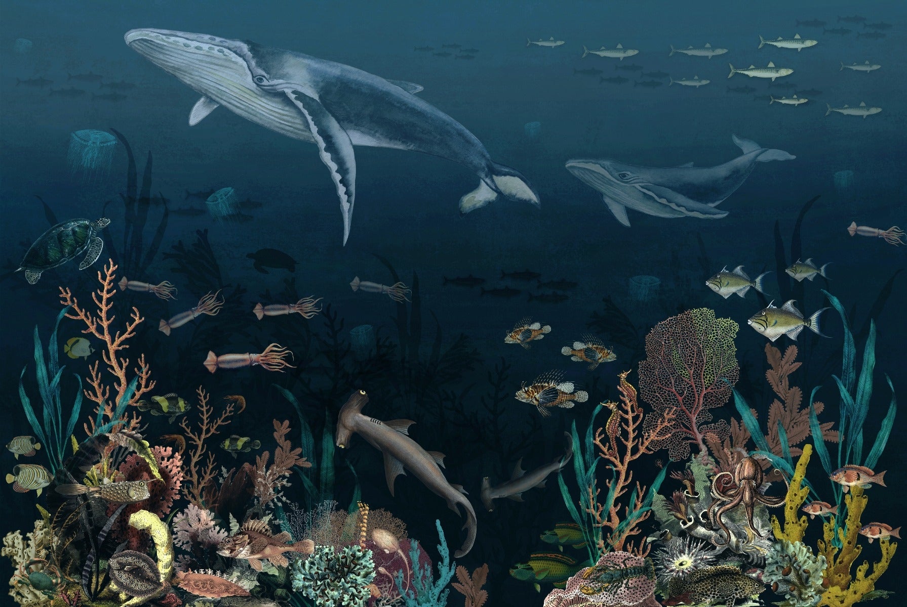 This ocean wallpaper has whales, fish, corals, and marine life all coming together for a calm and artistic representation of the underwater realm. With whales flitting through brightly colored corals next to these sharks and jellyfish, the design creates a tranquil yet adventurous mood. Perfect for a child''s room, this has an underwater vacation feel in the living room, and it is even better for a calming effect in a bathroom. Its vintage painting effect makes this ocean wallpaper inspirationally nature and art tied in with home, thus making it an interesting addition in any home for lovers of marine life or calm seascapes.