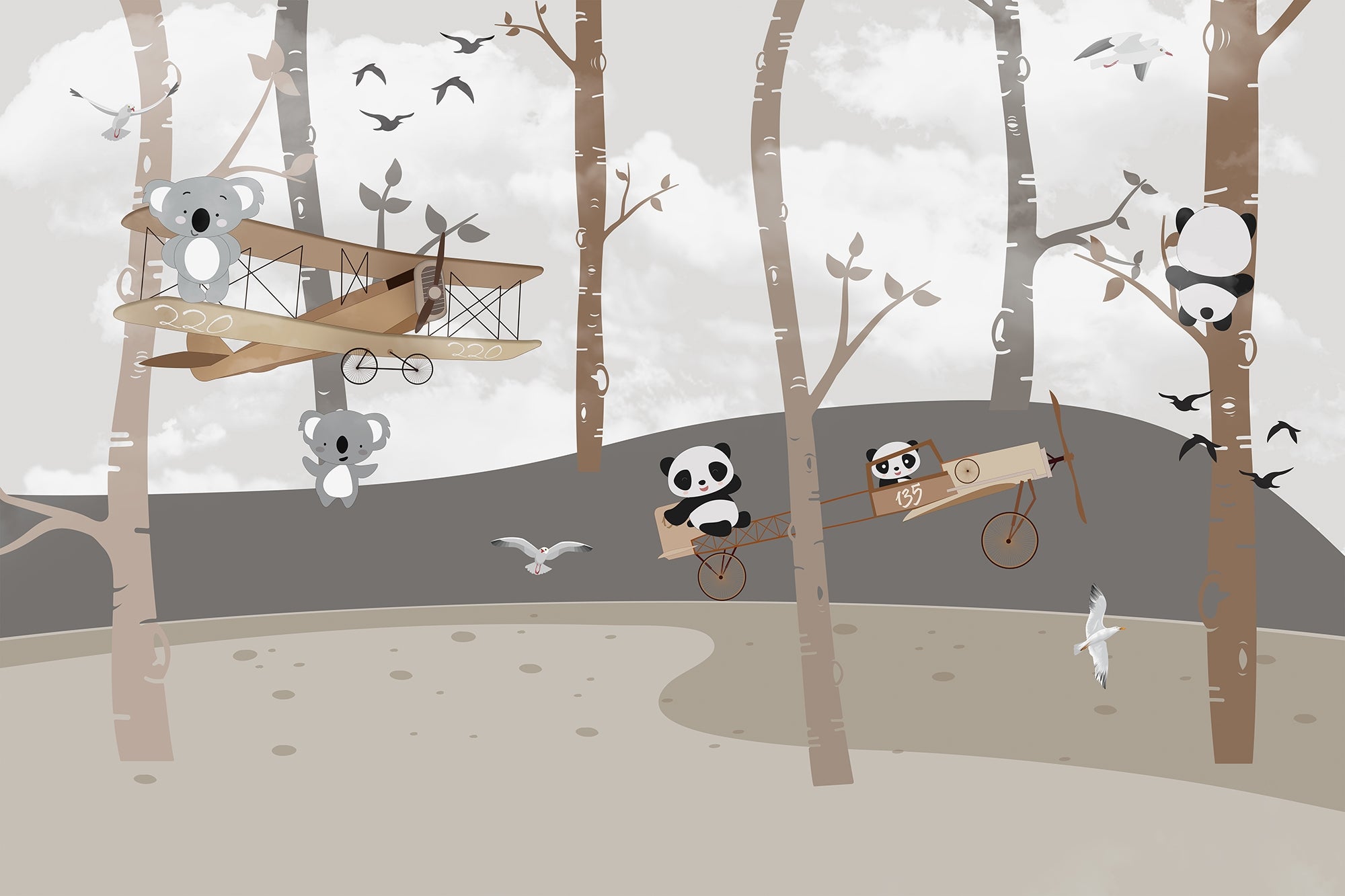 Whimsical mural with panda and koala aviators for kids' spaces.