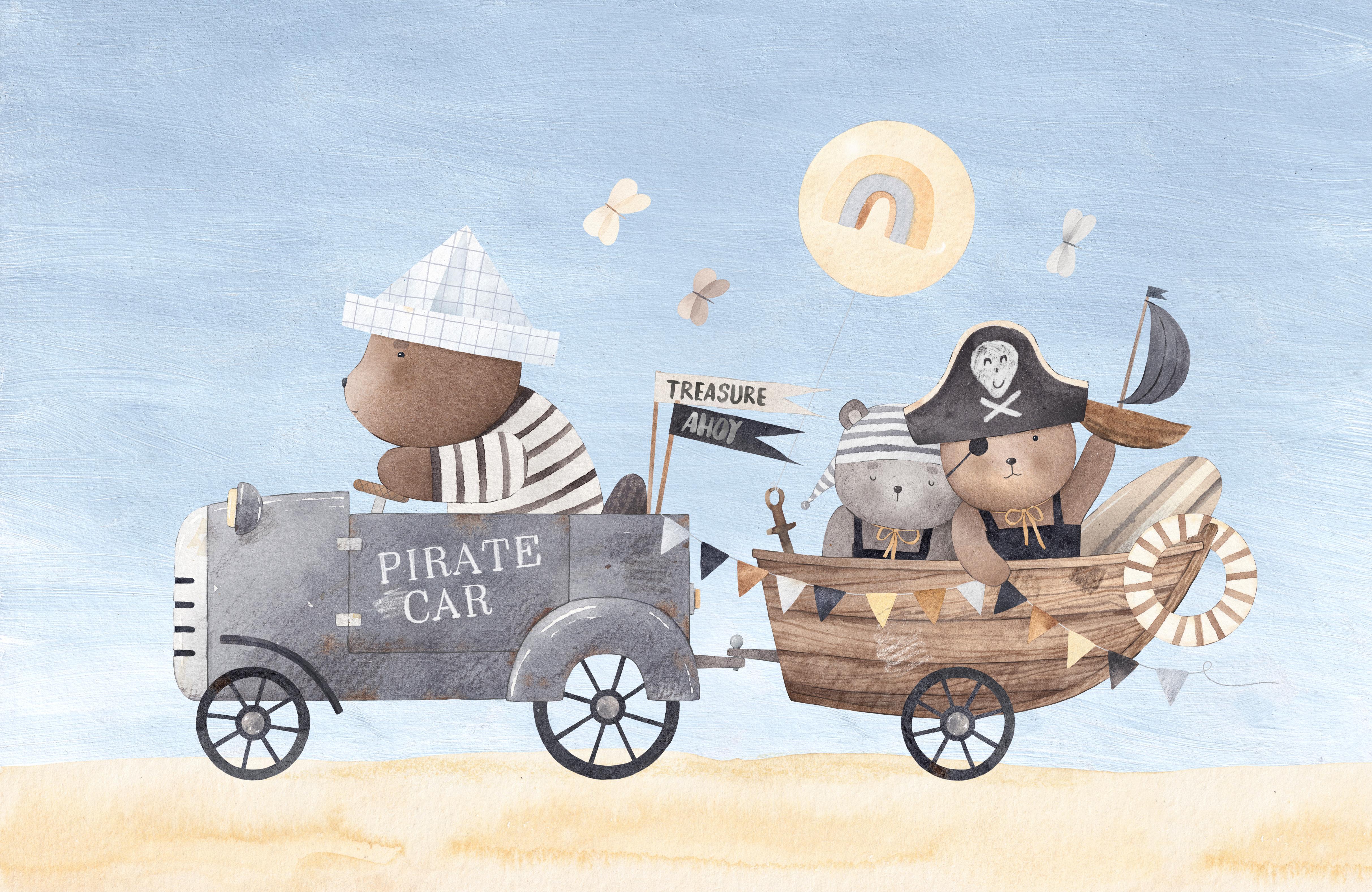 Embark on a seafaring journey in your little one's nursery or play area with the pirate bear adventure mural. Watch as your child's imagination sets sail alongside a charming crew of teddy pirates, hunting for treasure across calming blue seas. This Kid's room mural wallpaper will add a touch of whimsy to their space, filled with youthful spirit and adventure. It's crafted to inspire stories of ocean escapades and pirate maps. It's a playful addition that turns any room into a haven for play. Anchor your youngster's creative space with a design that speaks of endless fun and spirited quests.