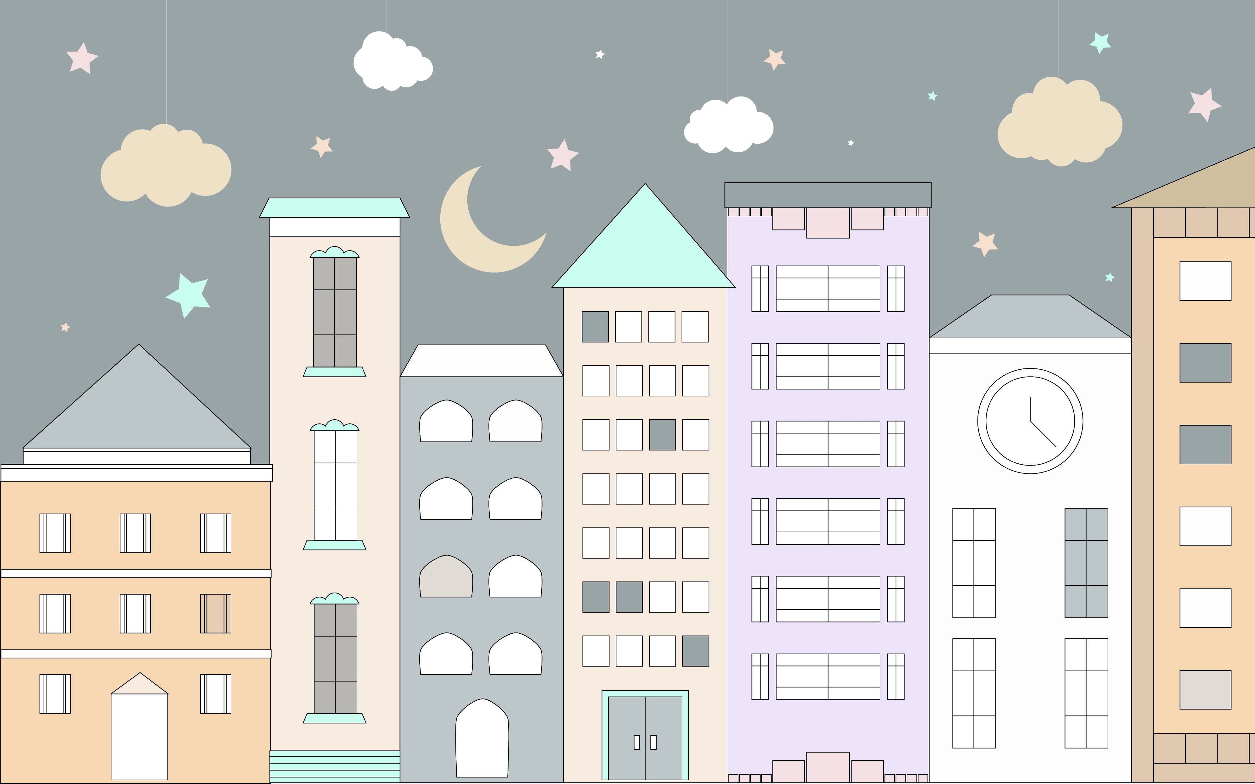 Playful town-themed mural for bright and imaginative interiors.