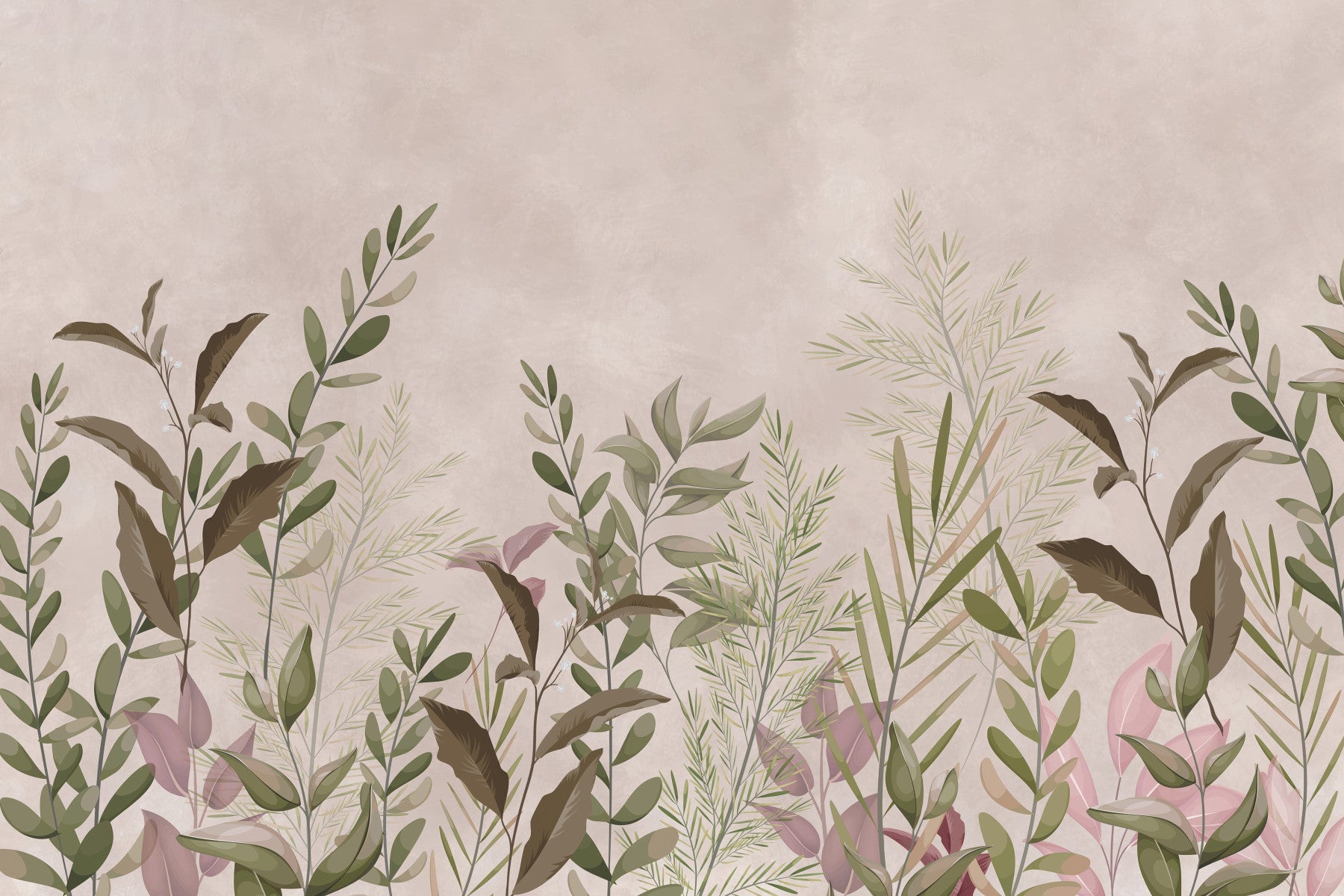 Escape to a world of tranquil beauty with 'Pristine Haven,' a wallpaper designed to bring the serenity of nature into your living space. This captivating design features a lush tapestry of botanical elements, meticulously rendered in soft, muted tones of green, brown and blush pink. Delicate leaves and slender stems dance across a textured, warm beige backdrop, creating a sense of depth and organic movement. The overall effect is one of understated elegance and calming sophistication.