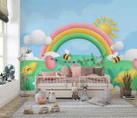 Bring the joy of a sunny day indoors with this cheerful design. A colorful rainbow arches over a field of blooming flowers, buzzing bees, and puffy clouds. The sun shines bright in a light blue sky. The pastel colors offer a soothing effect, perfect for kids' rooms or nurseries. This wallpaper for walls instantly brightens any space. It creates a fun backdrop and complements interiors by adding a touch of whimsy.