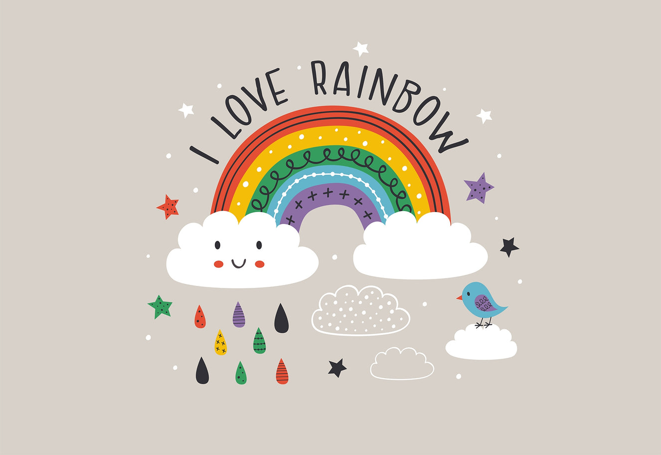 The Rainbow Scenery Kids Room Wall Mural is simply the epitome of delightful design, replete with colors of the rainbow, puffy smiling clouds, cute little stars, and rain droplets, along with this sweet little bird, really. This very well creates a joyful, imaginative space suited to nurseries, children's playrooms, and rooms where their children sleep, thus contributing to warmth and happiness in spaces. This rainbow wallpaper is designed to inspire creativity and happiness, making it an excellent choice for a fun and inviting environment that children will love.