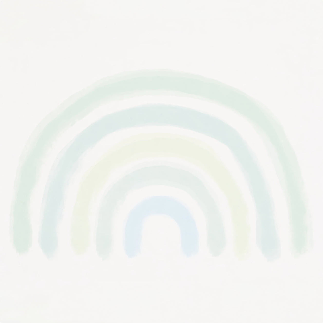 Kids nursery with rainbow wall mural and white wooden storage furniture on a rug.