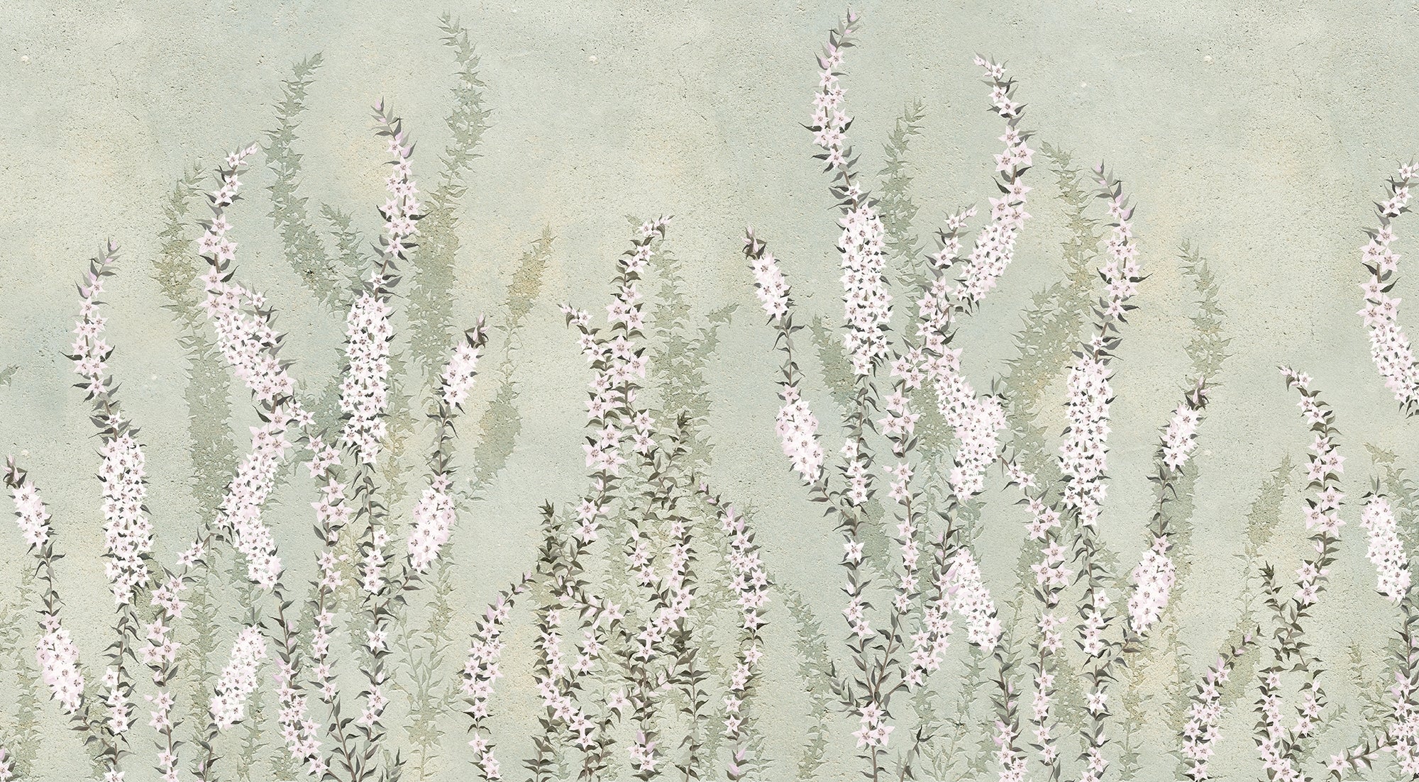 White orchids rising on a draped mural with green accents.
