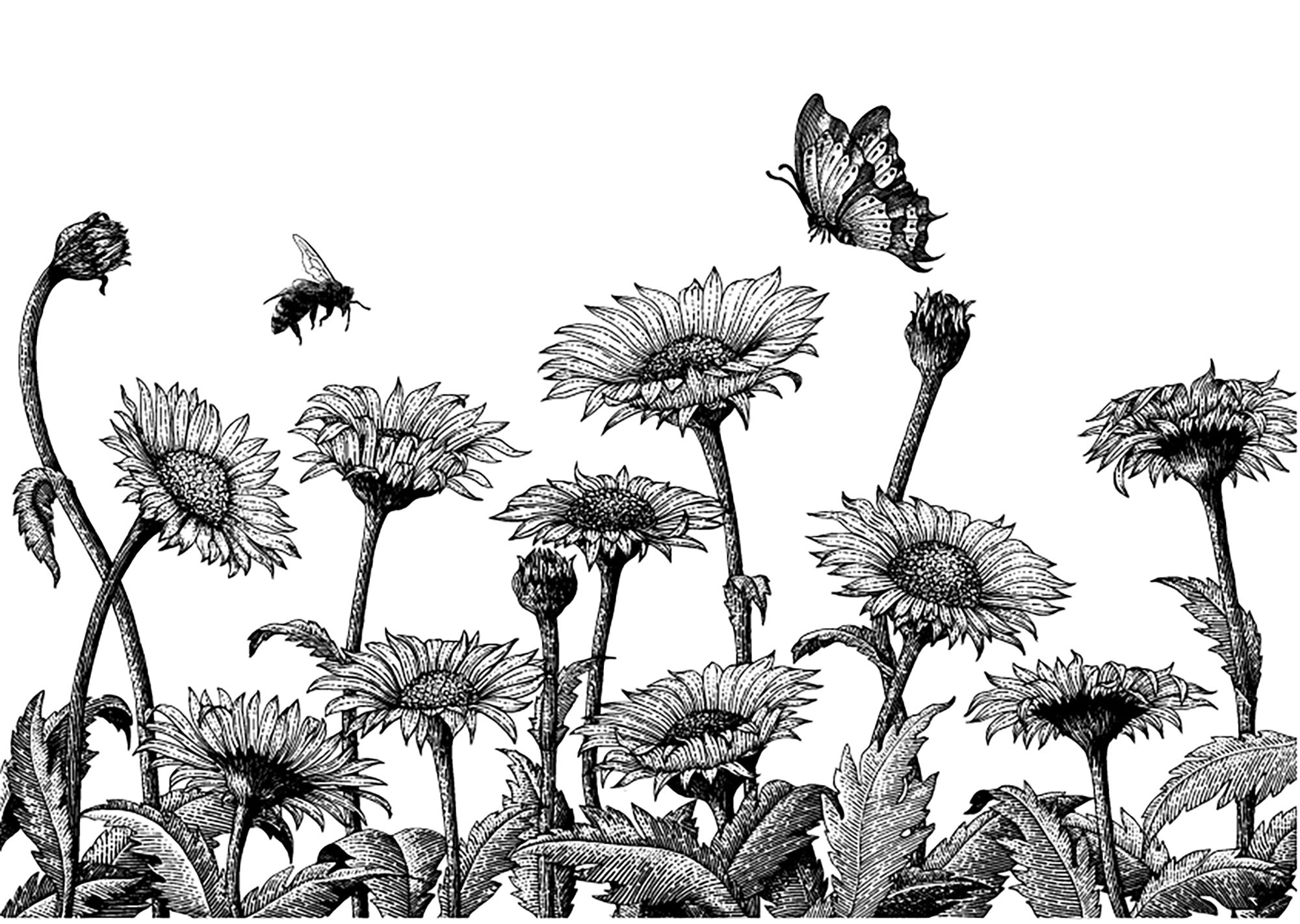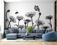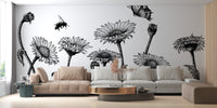 Artistic sketch mural of a sunflower field for elegant wall decor.
