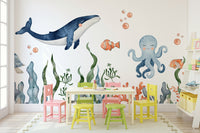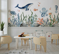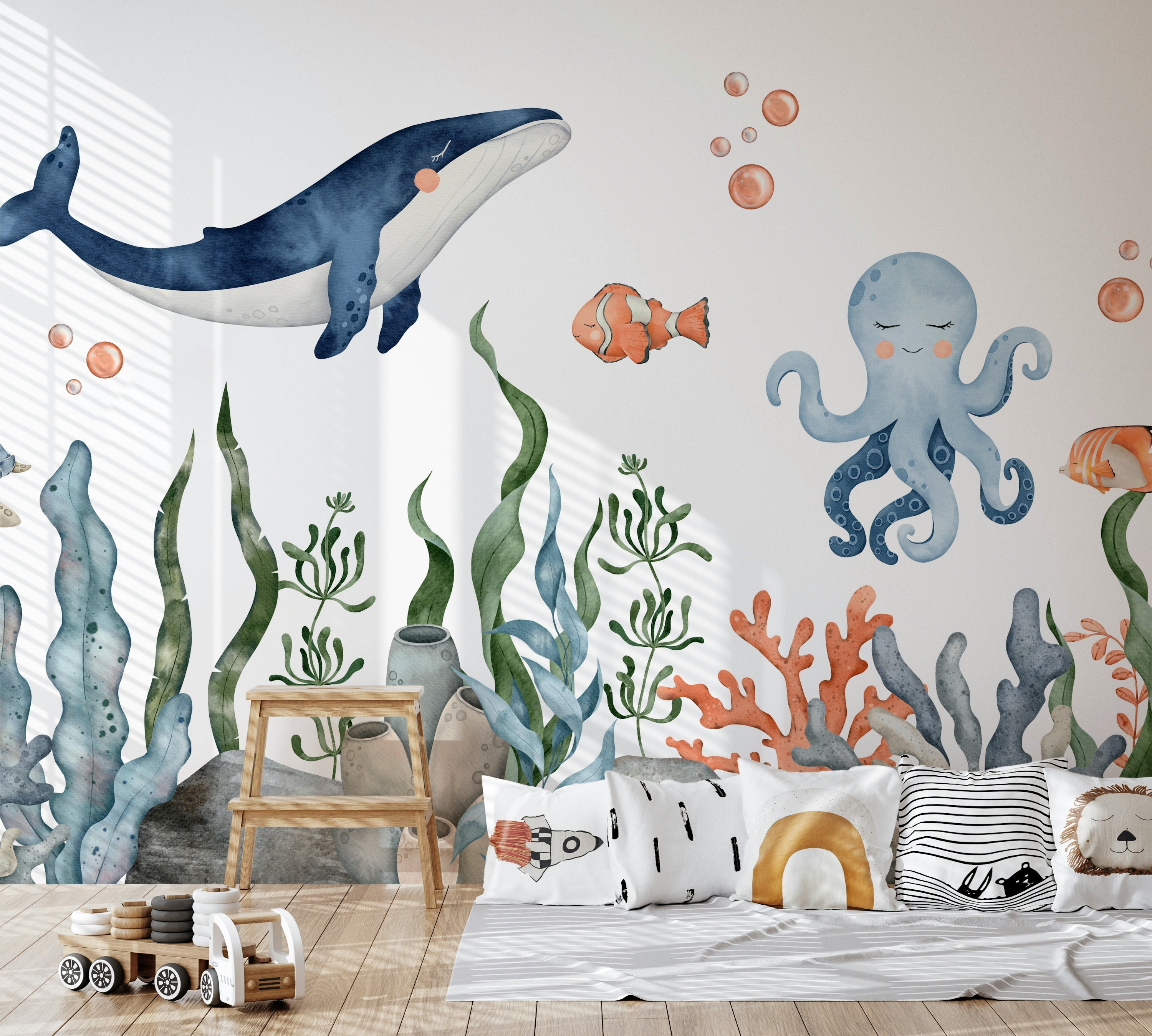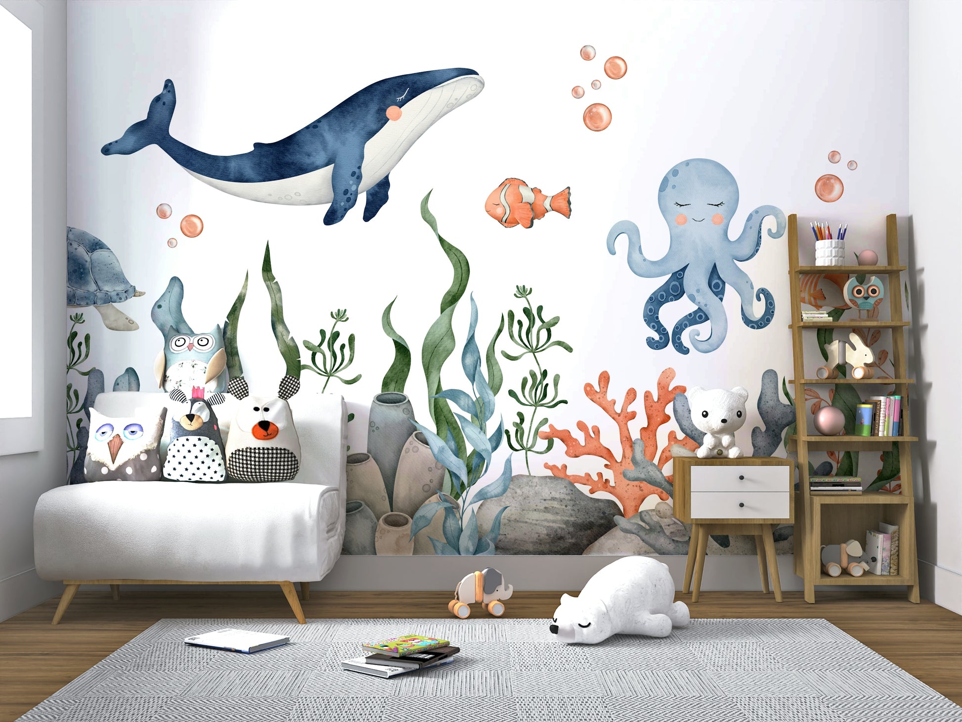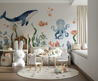 Dive into a world of underwater dreams with this charming wallpaper for walls. Featuring gentle sea creatures like whales, turtles, octopuses, seahorses, and clownfish, the design evokes a sense of calm and wonder. Muted shades of blue, green, and orange create a peaceful ambiance. This wallpaper suits a nursery, kids' room, or bathroom and turns any space into a serene marine sanctuary. Its soft hues and friendly characters complement interiors, creating a playful environment.