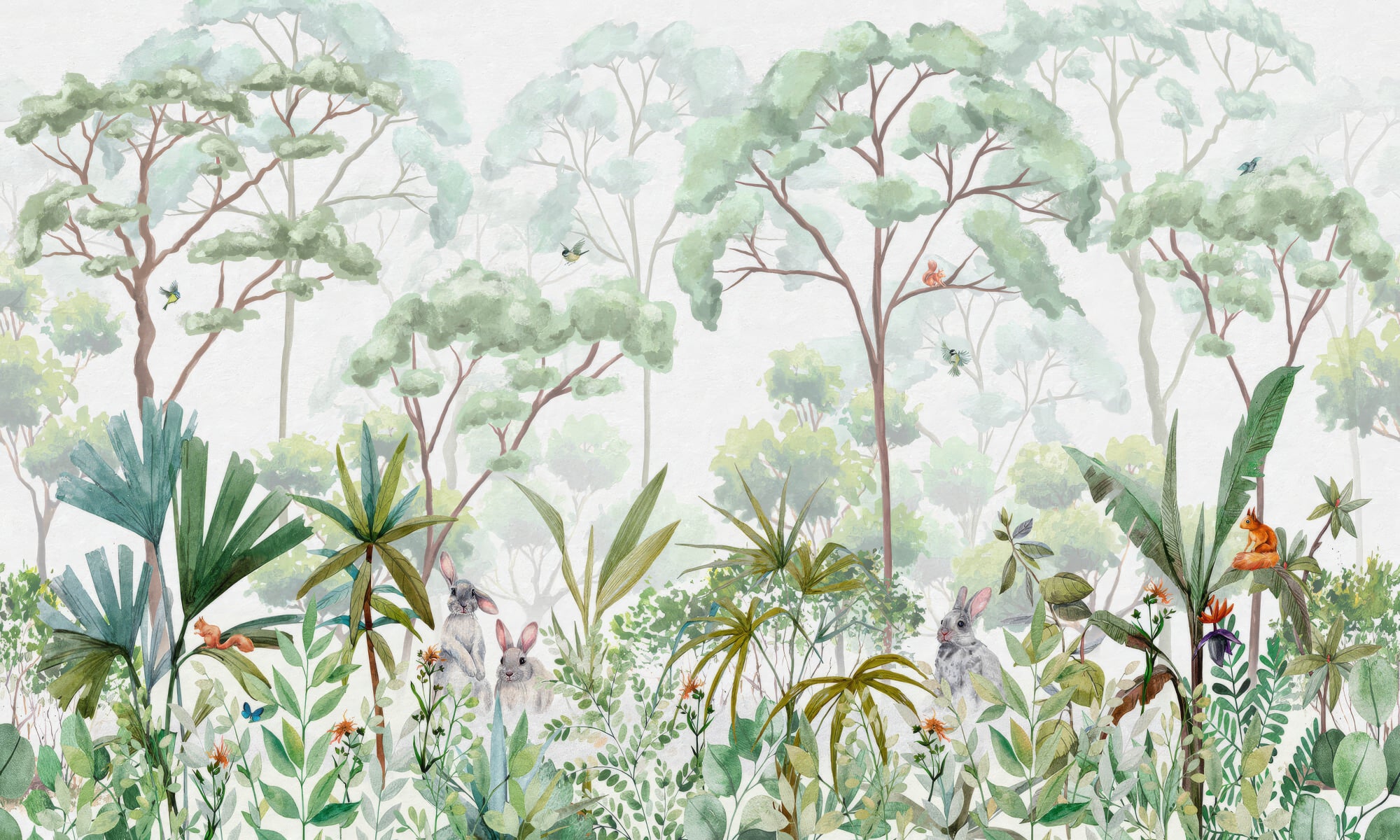 Watercolor rainforest mural with lush plants, trees, rabbits, and squirrels.