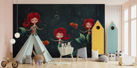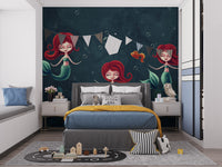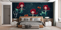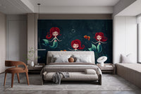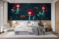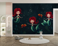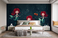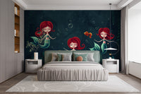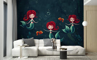 Transform your space into an underwater wonderland with the Three Underwater Mermaids Wallpaper Mural. Bring the serenity and mystery of the deep blue to your walls with this charming illustration that captures the fancy of the sea. The three graceful mermaids sport bright red hair as they interact peacefully with golden fish amidst the aquatic flora. This ocean design invites the tranquility of the ocean into any room, making it a great way to create a quiet space in a child's bedroom or add a splash of fantasy to a bathroom. It is an easy way to add character and playfulness to your decor, ensuring that the allure of the ocean is just a glance away.