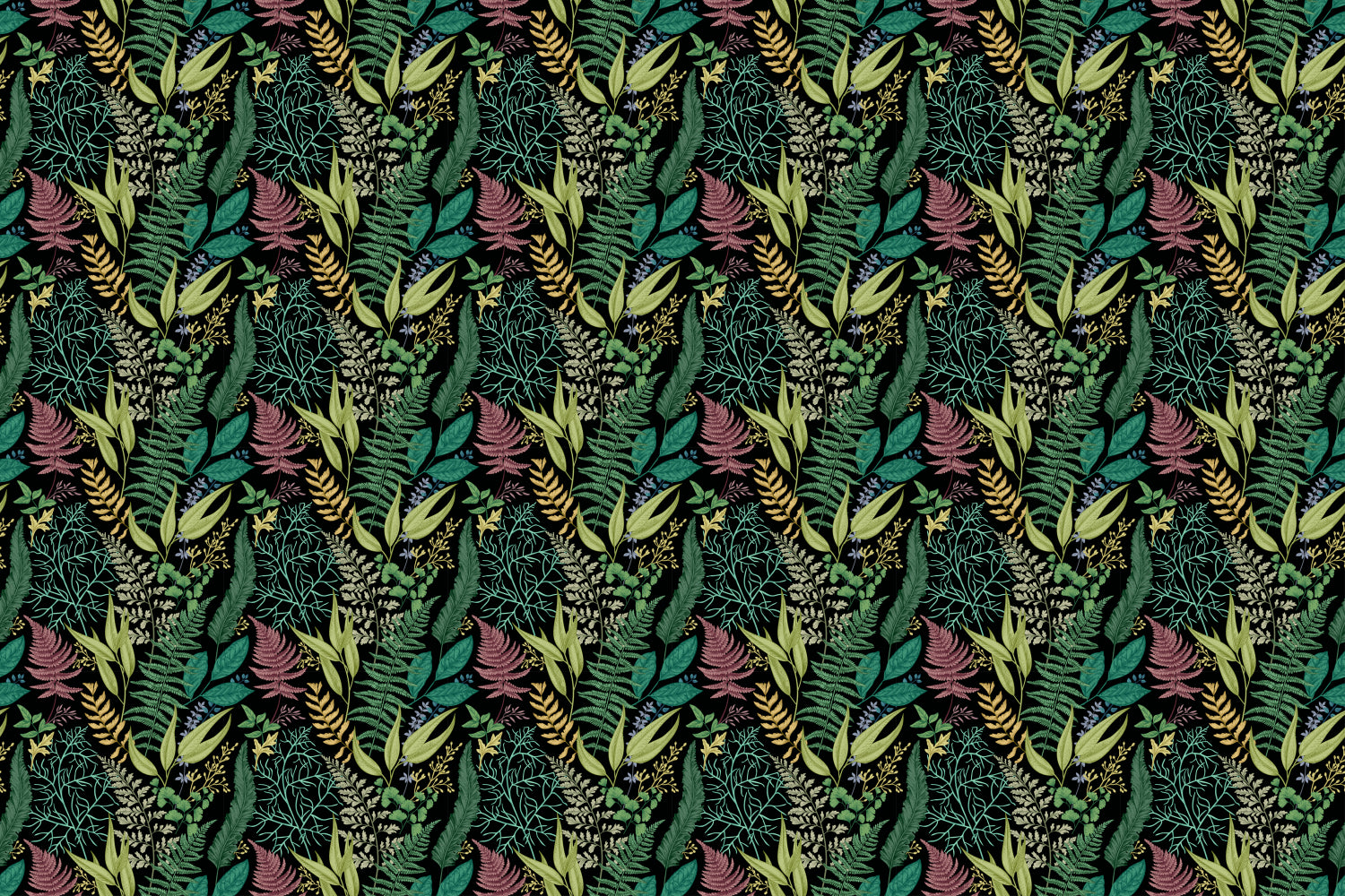 Vibrant and illuminated in every respect, here is a botanical mural wallcover entirely bursting forth with life, which transports you into the experience of an inspiring garden. All that will encase your walls is this beautiful leaf mural wallpaper: a lush view of ferns and exotic foliage with a striking dark background. Imagine that gorgeous botanical tapestry at the center of your home or work, easily diversifying nature into your personal space. Design every day with how this magnificent pattern drapes the room with greenery, ushering a continued invitation to view and experience nature's beautiful wildness.