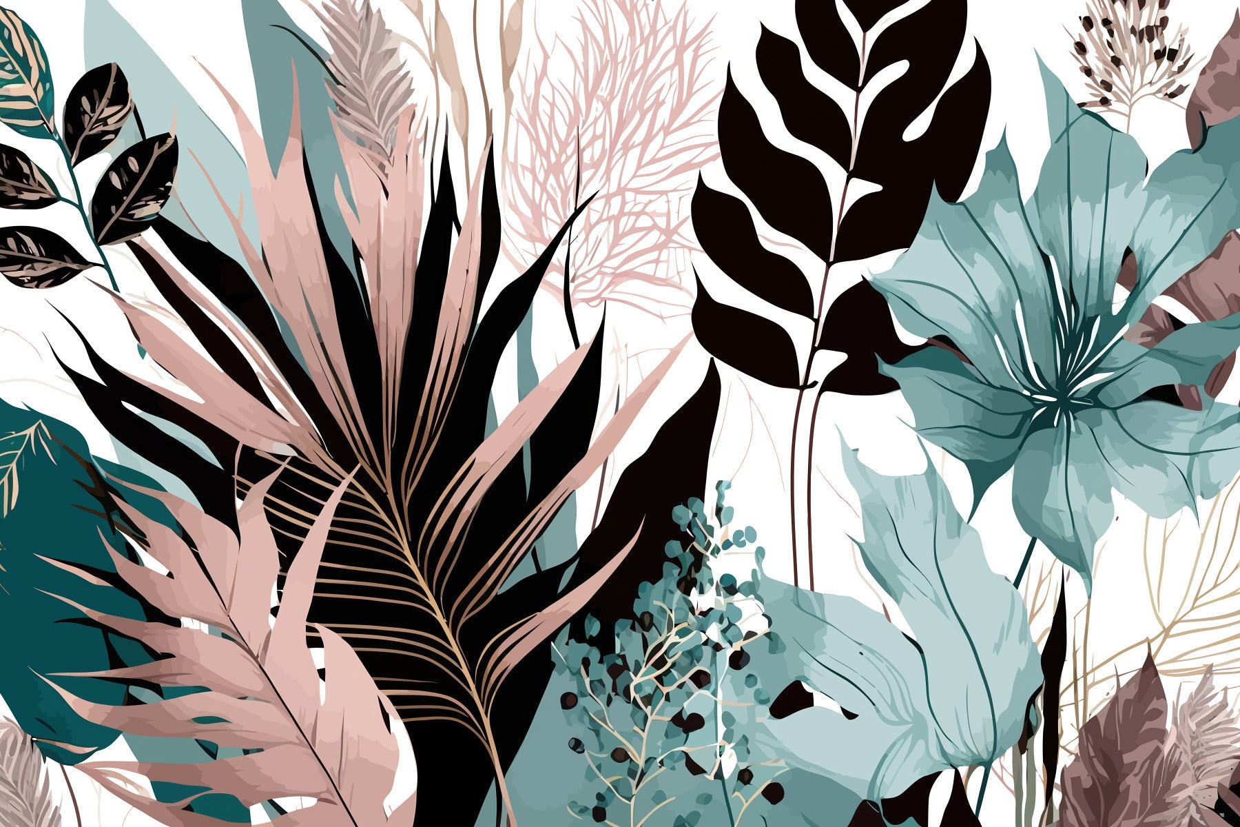 Bring the outdoors inside with this stylized leaf wallpaper. The black, pink, and teal hues create a cool, tranquil atmosphere. Use this wallpaper for walls in your living spaces to craft a soothing retreat. The elegant design complements both modern and traditional homes, making it a versatile option for any room seeking a touch of organic beauty. Enjoy the beauty!