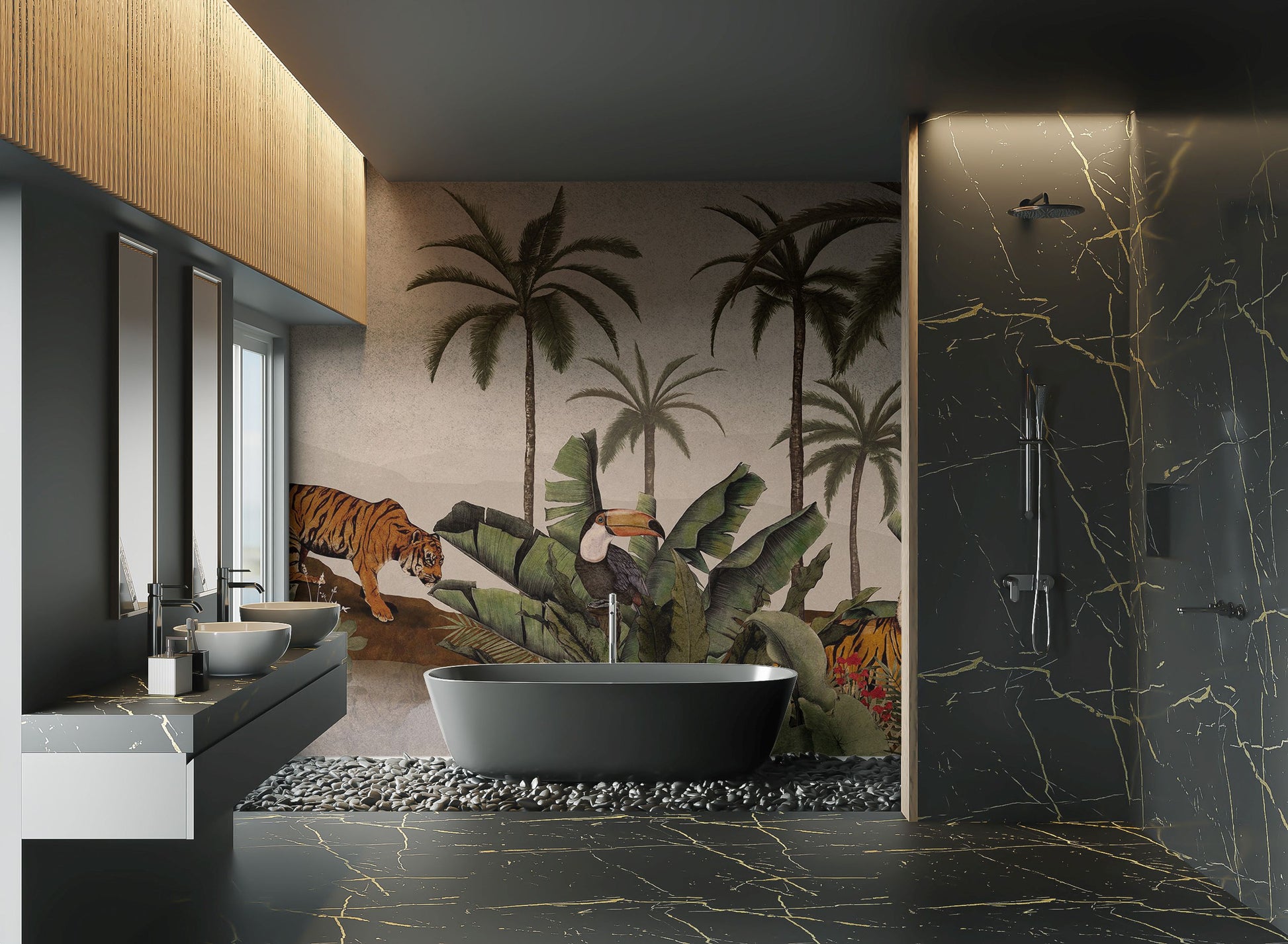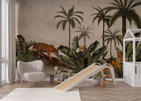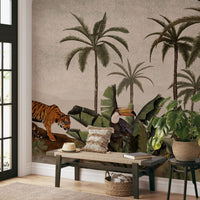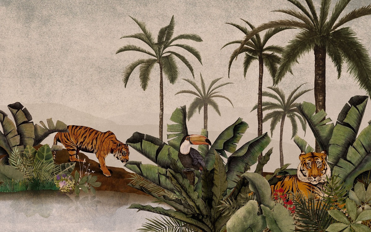 The Tropical Tigers in Jungle Wall Mural reveals an exciting charm, with the minute details of grand tigers striding across the lush greenery. The striking design brings palm trees and foliage to life, adding vibrant color to any room. The elements of exotic wildlife add an adventurous touch, drawing one back to the plethora of diversity that would be found in a tropical jungle. Whether for the living room or bedroom, this mural brings into your environment the untamed beauty of nature. An investment in this mural results in a focal point that celebrates the splendor of tropical landscapes.