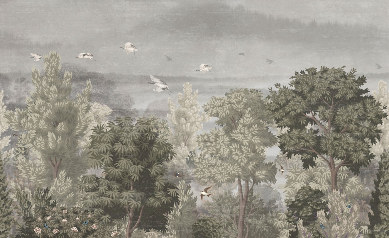 Tropical tree forest wallpaper with sculpted treetop clusters.
