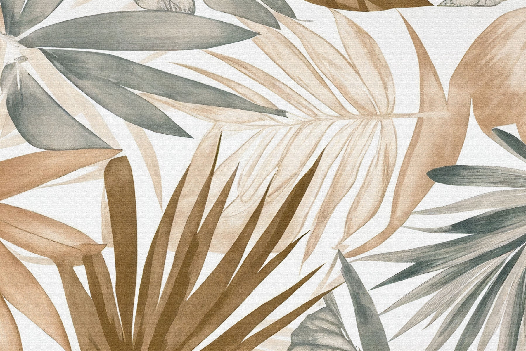 This elegant botanical wallpaper brings the feeling of a calm tropical retreat into your space. Muted greens, warm browns, and soft beige create a soothing and sophisticated backdrop. The gentle watercolor style adds a touch of artistry and depth. Ideal wallpaper for walls in living rooms, bedrooms, or home offices, this design works effortlessly to enhance any room’s ambiance. Its subtle colors and organic style complements interiors, making it a versatile choice for various décor styles.