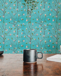 Turquoise Background Chinoiserie Magnolia Tree Flower Wallpaper