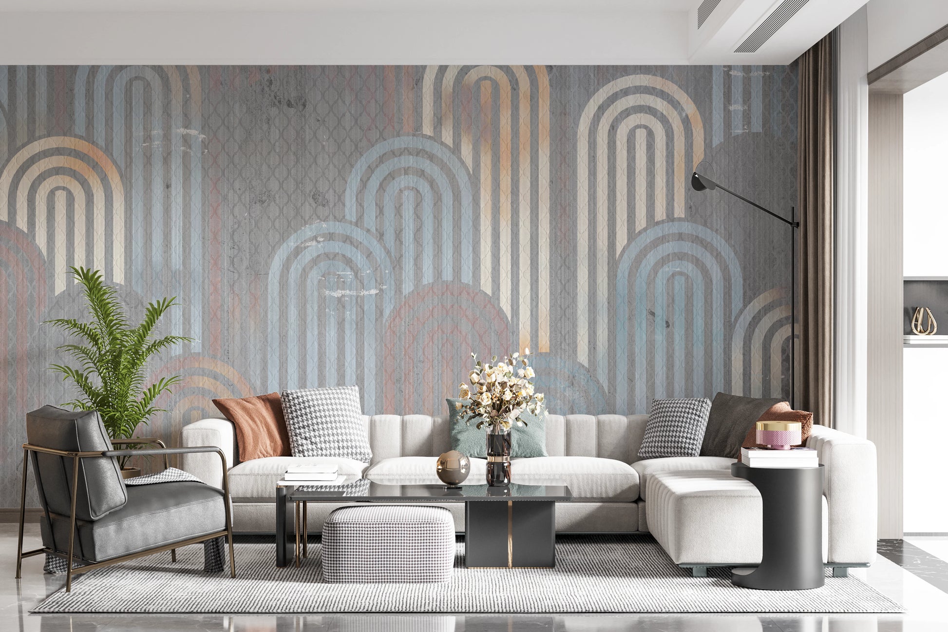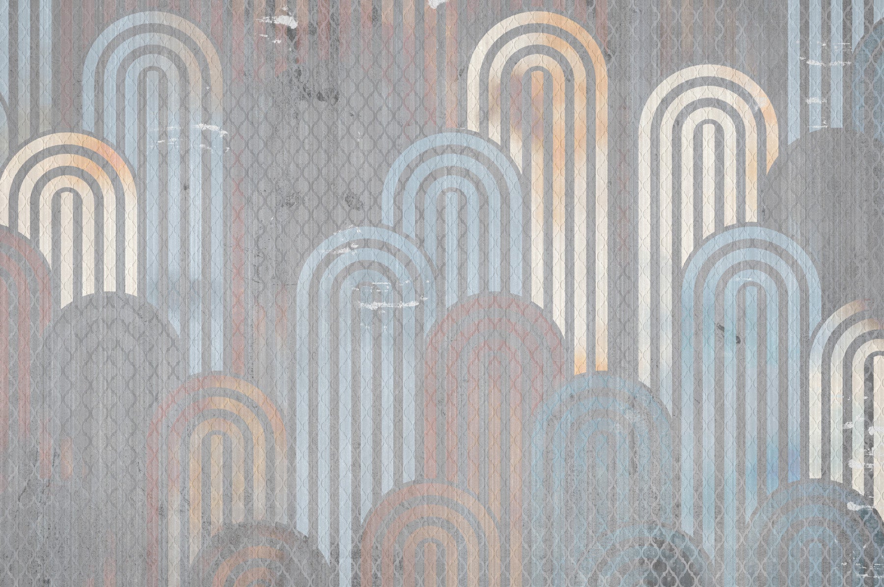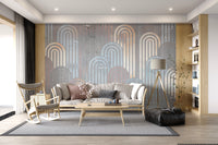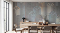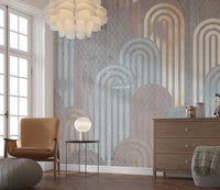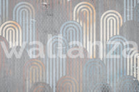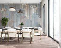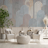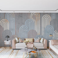 Embrace a touch of retro charm with this captivating wallpaper. The design features archway shapes in muted blues, oranges, and creams, layered against a textured, grey background. This pattern adds depth and visual interest to any space. Use this wallpaper for walls to create a sophisticated and welcoming atmosphere in your living room, bedroom, or hallway. Its calming color palette creates a beautiful statement while seamlessly complementing your existing décor.