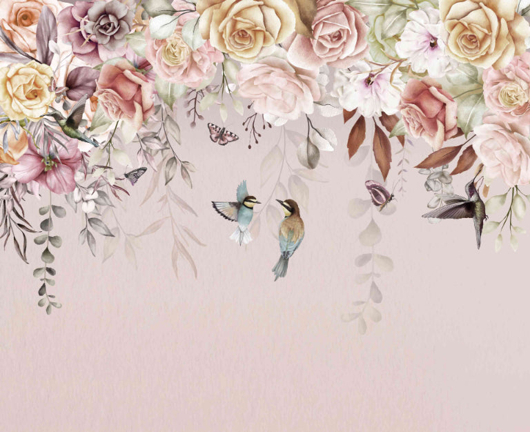 Romantic bouquet-inspired mural with roses, birds, and butterflies on a muted background.