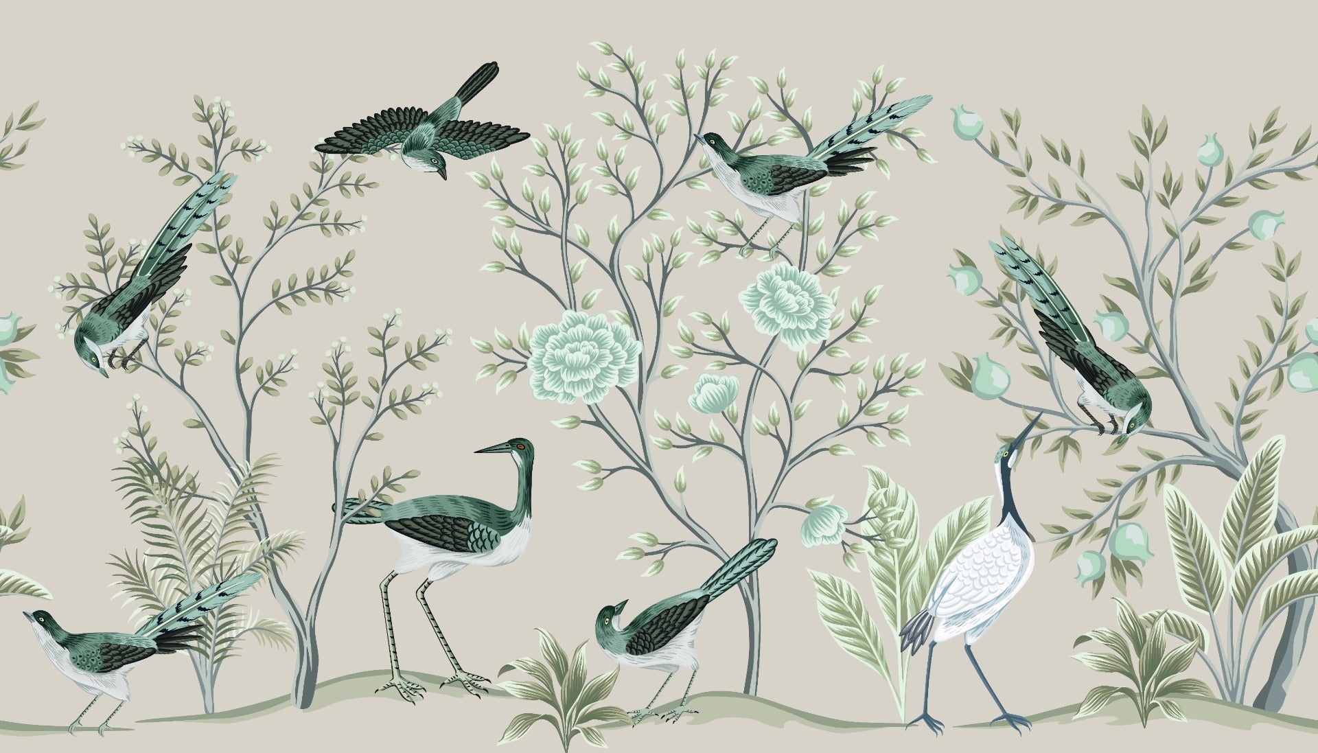 Crane birds and floral garden mural for classic wall decor