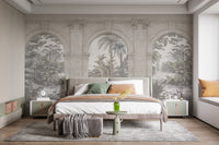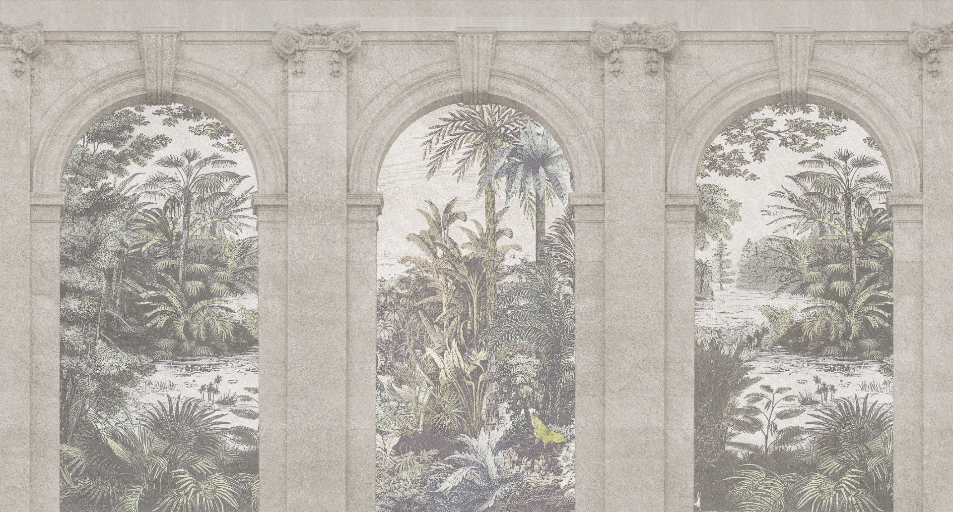 The Vintage Structure Texture Wallpaper Mural combines classical architecture with lush tropical scenery for a sophisticated and timeless design. Featuring detailed stone arches framing serene landscapes of tropical greenery, this mural brings a sense of elegance and depth to any room. Ideal for dining areas, living rooms, or offices, its neutral gray tones and intricate textures seamlessly blend with modern or traditional decor. The artistic balance of architectural elements and natural beauty creates a captivating focal point, perfect for adding a touch of old-world charm. Easy to install and maintain, this wallpaper transforms your space with refined style and understated luxury.