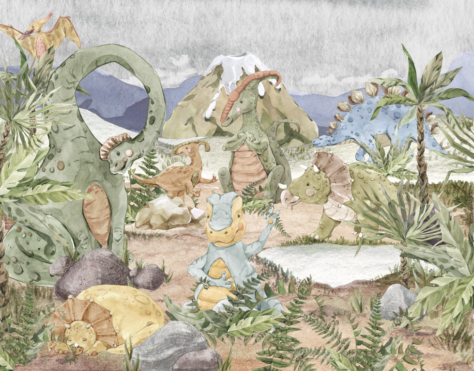 Whimsical watercolor mural of playful dinosaurs in a lush prehistoric landscape.