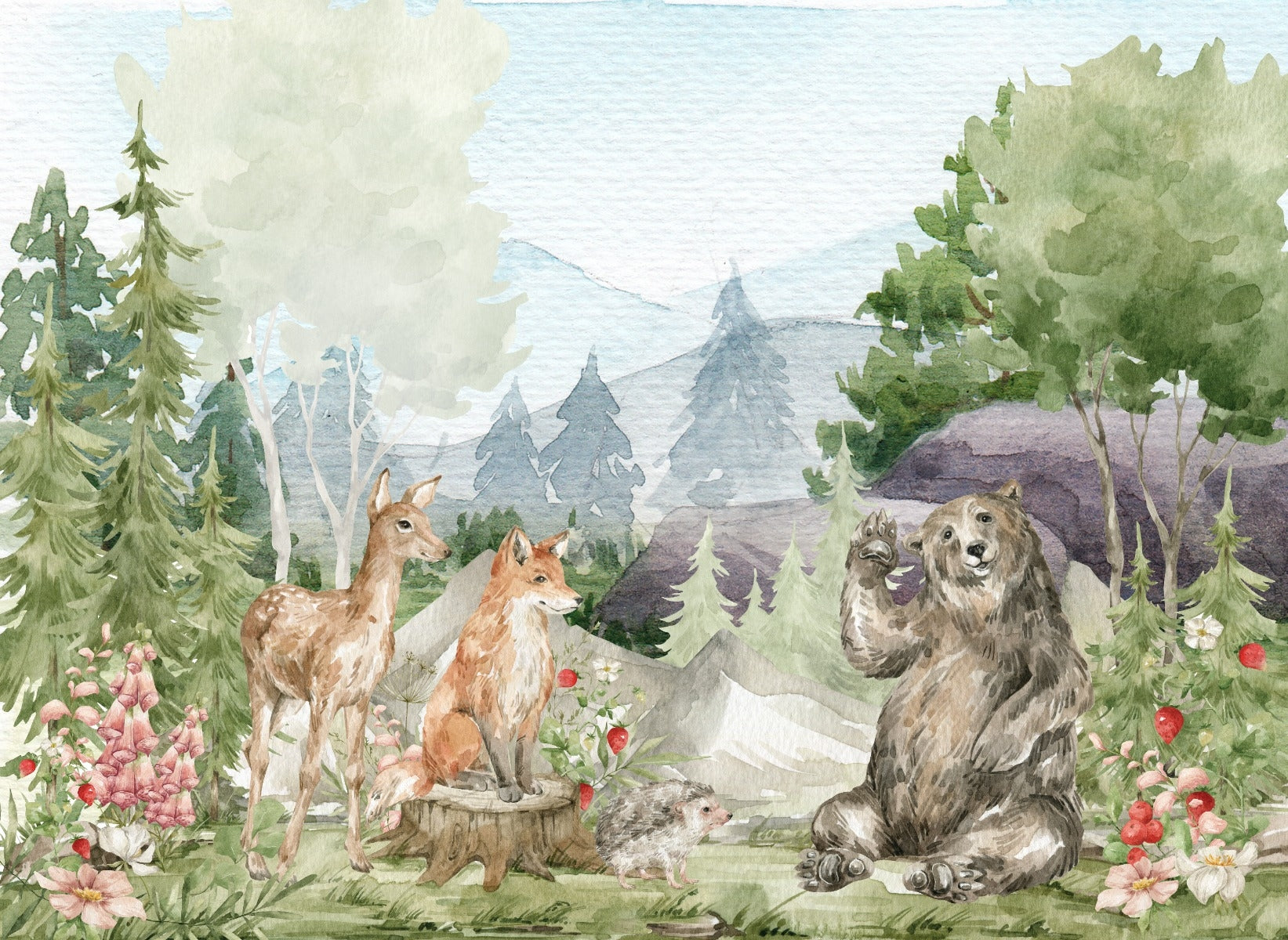 Bear and deer in watercolor forest wallpaper for kids’ rooms