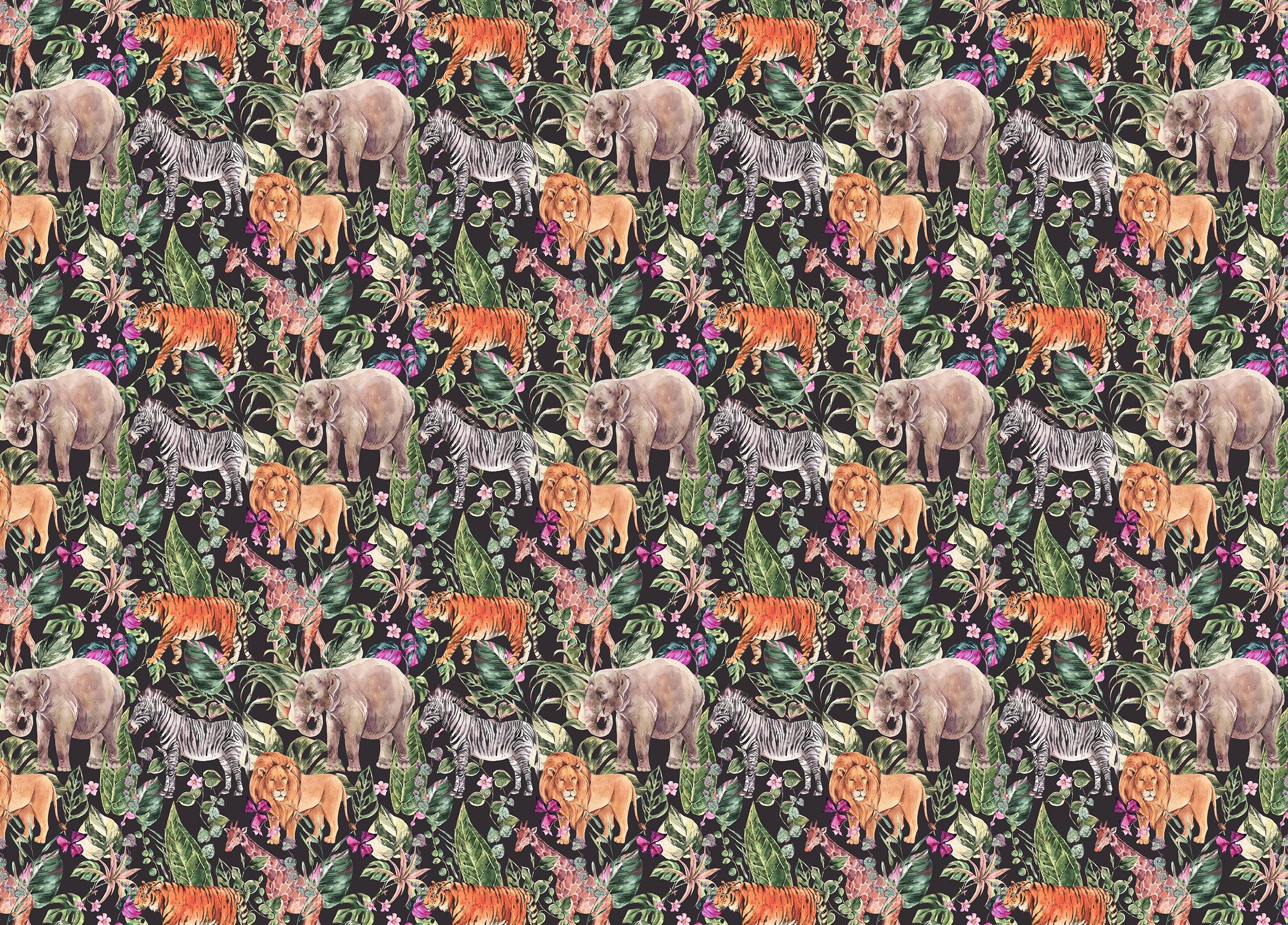 Vibrant safari-themed wallpaper with jungle and floral elements