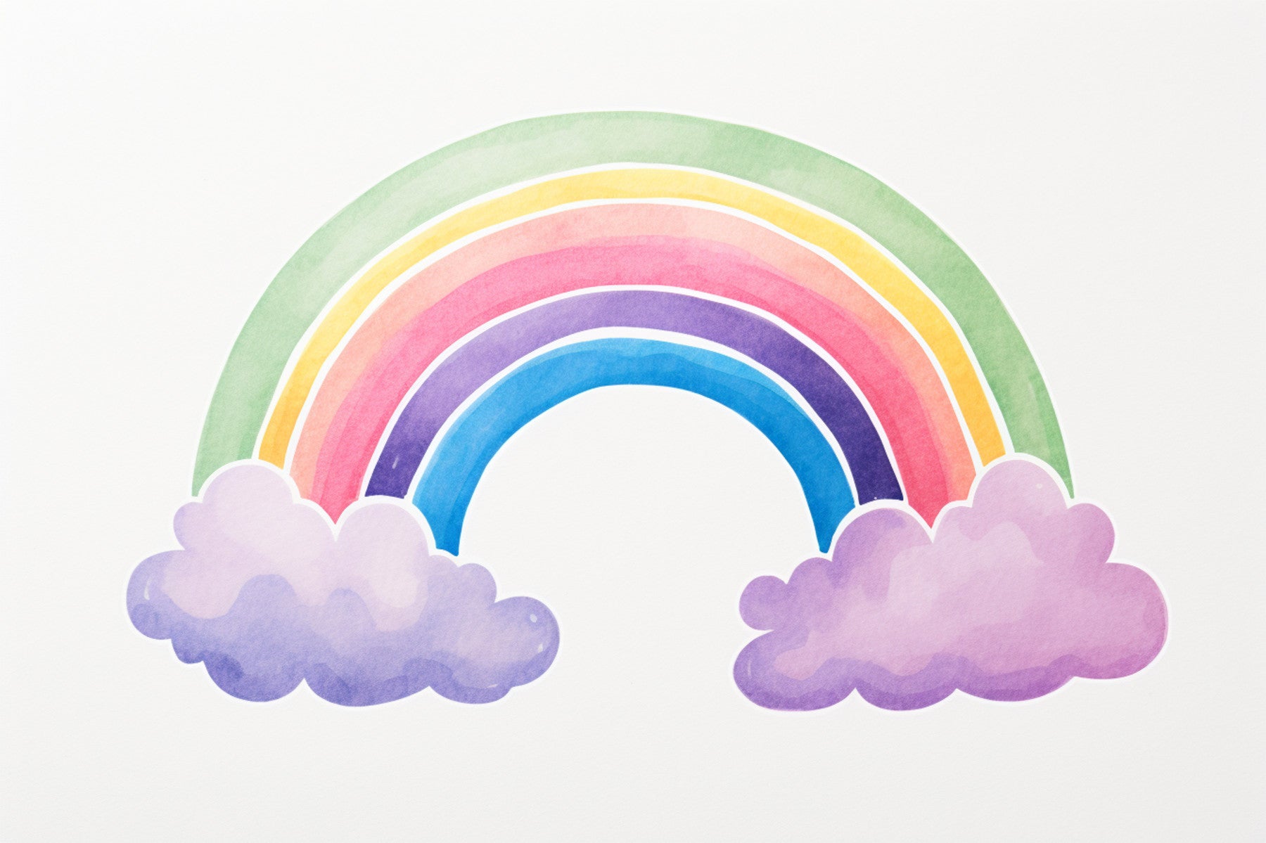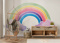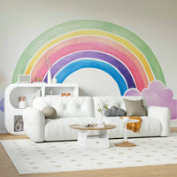 Bring a touch of whimsy to your space with this delightful watercolor rainbow wallpaper for walls. Soft pastel hues of green, yellow, pink, blue, and purple blend seamlessly, forming a classic rainbow arching over fluffy cloud formations. Ideal for a nursery or kids' room, this cheerful design adds a playful element. It also suits any room seeking a lighthearted and calming atmosphere. Let this inviting scene uplift your walls and create a positive mood.