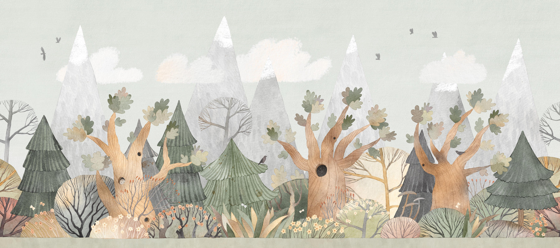 Bring the serenity of nature indoors with this whimsical woodland wallpaper for walls. A muted palette of greens, browns, and whites blends with a hand-drawn artistic style. This design displays a dreamy forest scene with snow-capped mountains in the distance. The illustration features a variety of trees and foliage, with little details that add character. It's ideal for a kid's room or a nursery. The wallpaper will create a calm, inviting space and works well in bedrooms or playrooms. The gentle colors and design enhance interiors without overwhelming.