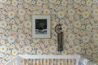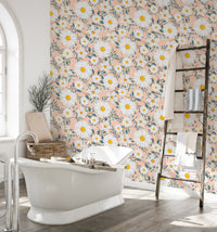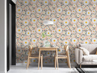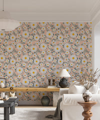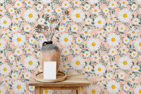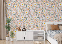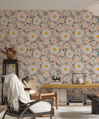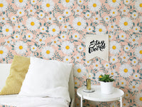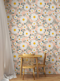 Refresh your interiors with this white daisy flower wreath branch and leaves flower wallpaper. It's a burst of spring that captures the essence of nature's beauty, featuring a harmonious arrangement of white daisies, woven into wreaths, complemented by subtle branches and lush foliage. Perfect for those seeking a serene and natural backdrop, this flower wallpaper melds the freshness of floral design with contemporary styling, breathing new life into any room.
