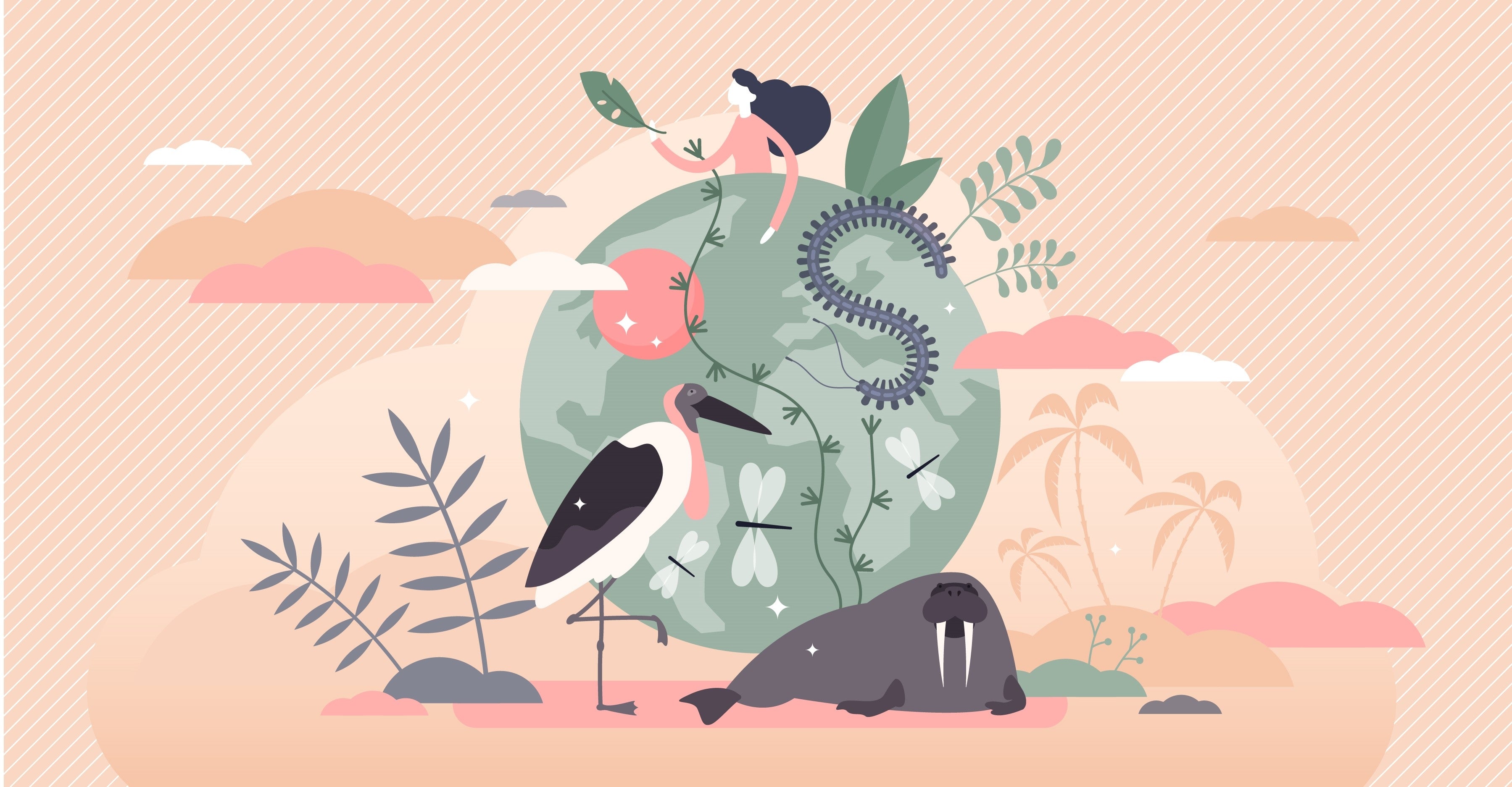 Artistic mural of a wild kingdom floating over Earth’s scenery.