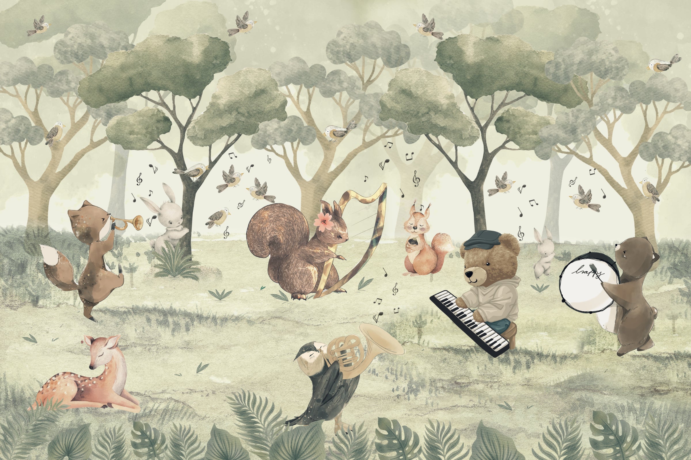 Create a wonderful ambiance in your child's room with the wildlife concert wallpaper, an energetic scene where animals play musical instruments amidst a lush green forest. This fantastic wallpaper mural combines the jungle's natural beauty with the charming spirit of an animal orchestra to set the perfect nursery or playroom. Soft green tones and cute wildlife characters bring wonder to your wall. There's no better place for kids. Made of quality materials, this wallpaper will stand the test of time and deliver playful styles in each space. Enjoy free delivery and hassle-free installation. Secure yours today!
