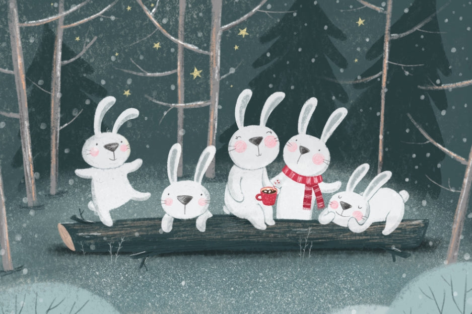 Experience a delightful scene on your walls where playful rabbits dance under starlit skies. This winter wonderland rabbit wallpaper mural is perfect for a child's bedroom or play area. Imagine the joy of watching these charming creatures frolic through a snowy forest, sparking stories and dreams in young minds. This mural brings a touch of whimsy and magic to any room, creating a playful backdrop that encourages imagination. Perfectly suited for nurseries or kids rooms, this mural enhances the playfulness of a space, making every day feel like a snow-filled adventure. Choose this mural to bring a narrative of joy and wonder to life.