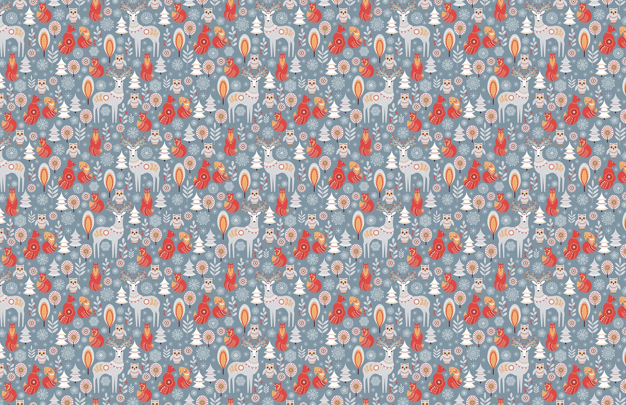 Winter Wonderland with Deer and Fox Wallpaper is a beautiful and cheerful seasonal scene with play deer, foxes, owls, and Christmas trees on soft blue ground. The warm tones of red, orange, and white add magic to it. This kids wallpaper will add that little bit of whimsy and cheerfulness to your child's room, holiday decorations, or cozy places. The intricate patterns and lively illustrations bring warmth and character, making it an inviting choice for those seeking to create a festive, storybook-like atmosphere in their interiors.
