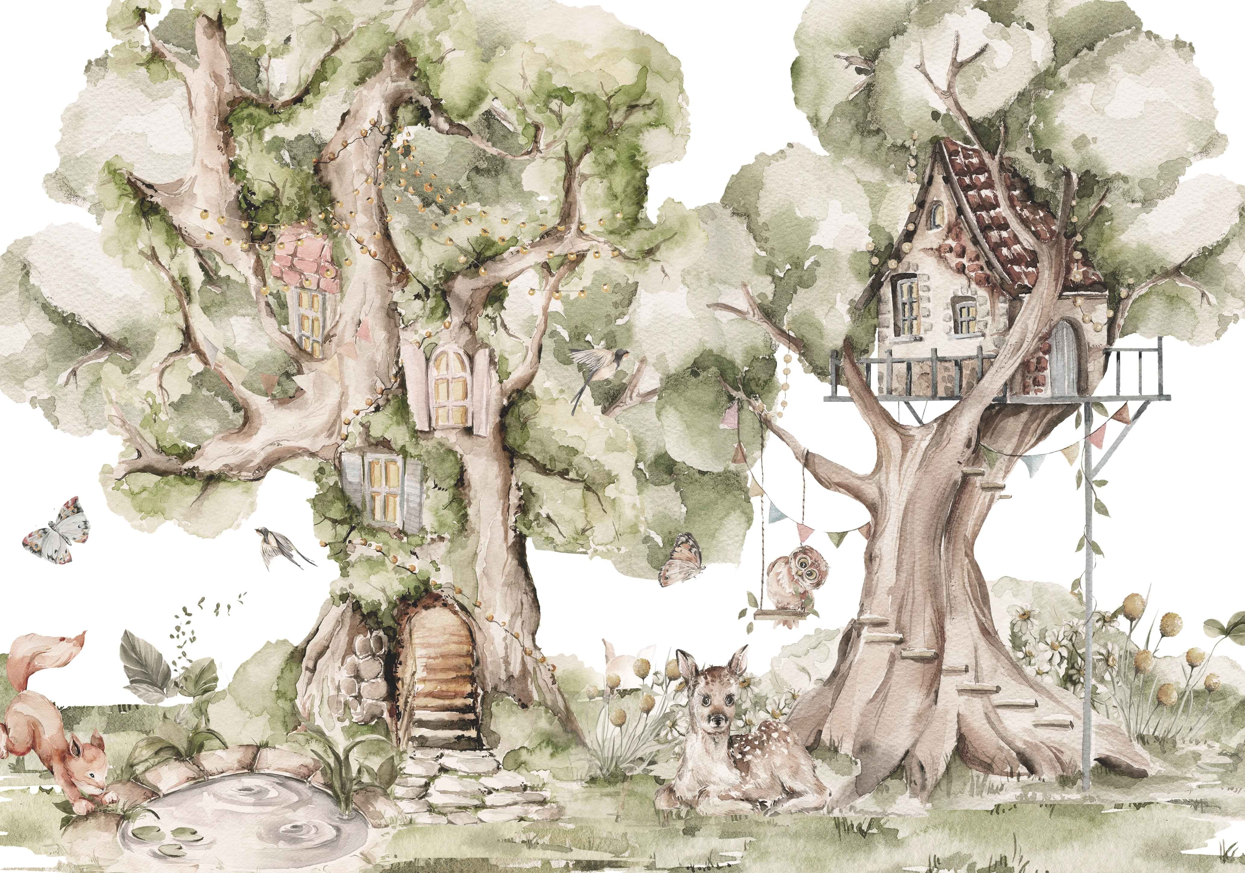 Bring the tranquil forest inside your home with the Woodland Treehouse Wall Mural. This mural picture-perfectly represents a snug little tree house perched between tall trees, bringing the outdoors indoors. The soft, comforting greens of the trees, nature, and the greens, air create a calm, gentle atmosphere. This green wallpaper is ideal for use in bedrooms, playrooms, or any area you want to feel closer to nature. A detailed design for life, warmth, and adventure in that room is perfect for lovers of nature or those who want something to say in their decor.
