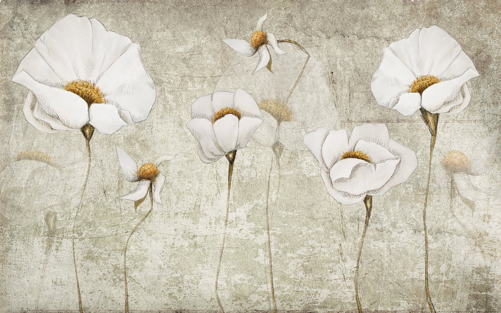 Worn White Blossom Oasis Wall Murals—a serene and rustic haven. This mural offers subtle, delicate white blossoms against an old textured background and leaves one with timelessness, beauty, and understated charm. Soft florals add depth to your walls while the aged textures bring it in order to create a perfectly soothing, welcoming atmosphere.